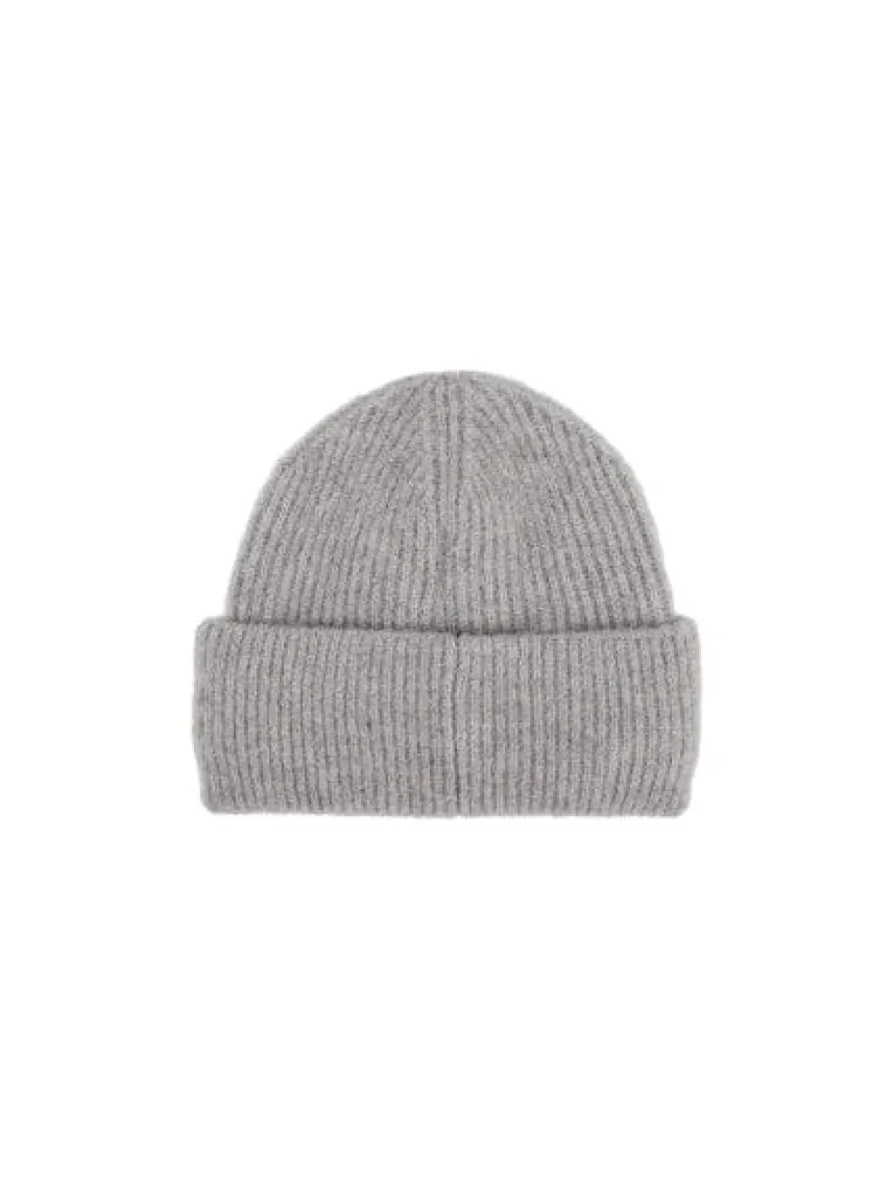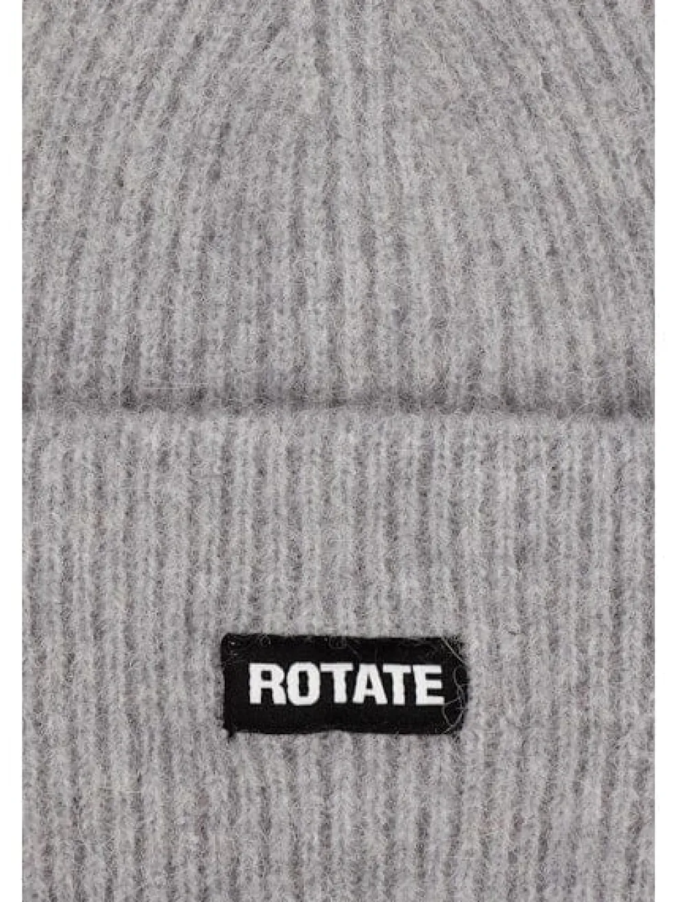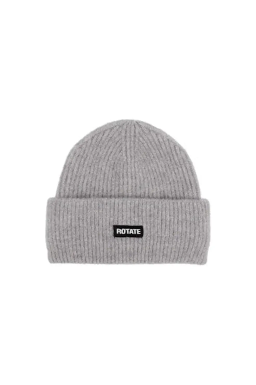 Ribstrikket beanie fra Rotate i lysegrå. Den har et sort patch med ROTATE-tekst på forsiden og en foldet kant.