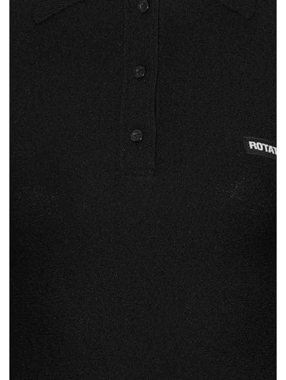 Sort polokjole fra Rotate i slinky knit-stof. Kjolen har lange ærmer, en polokrave med knapper og en svajet nederdel.
