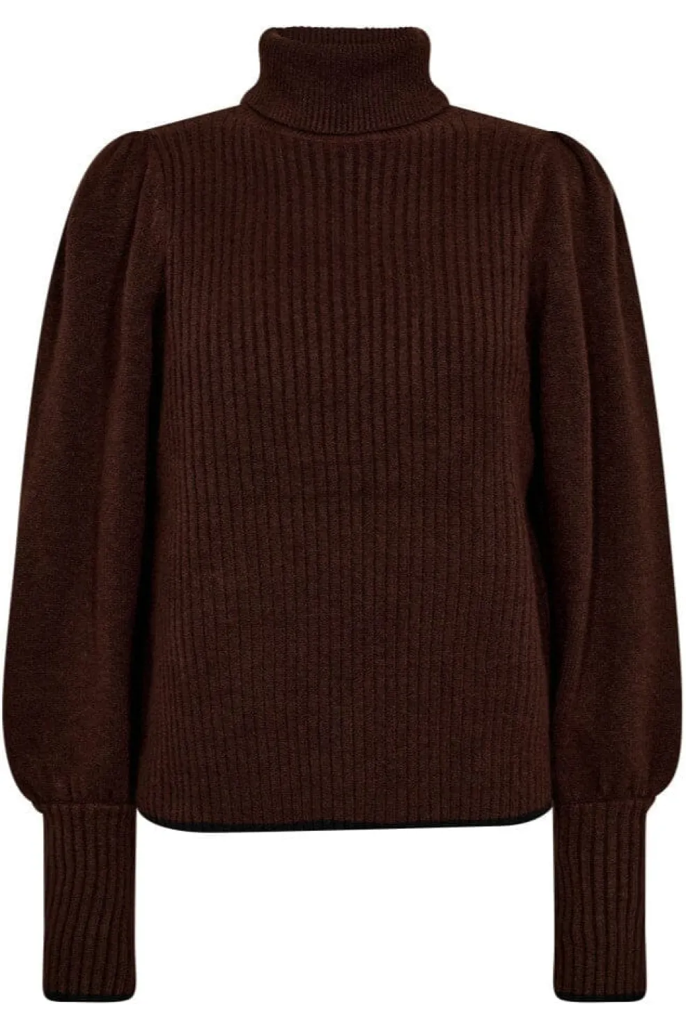 Mørkebrun sweater fra Co´Couture med ribbet tekstur over hele trøjen. Den har pufærmer og en høj rullekrave.