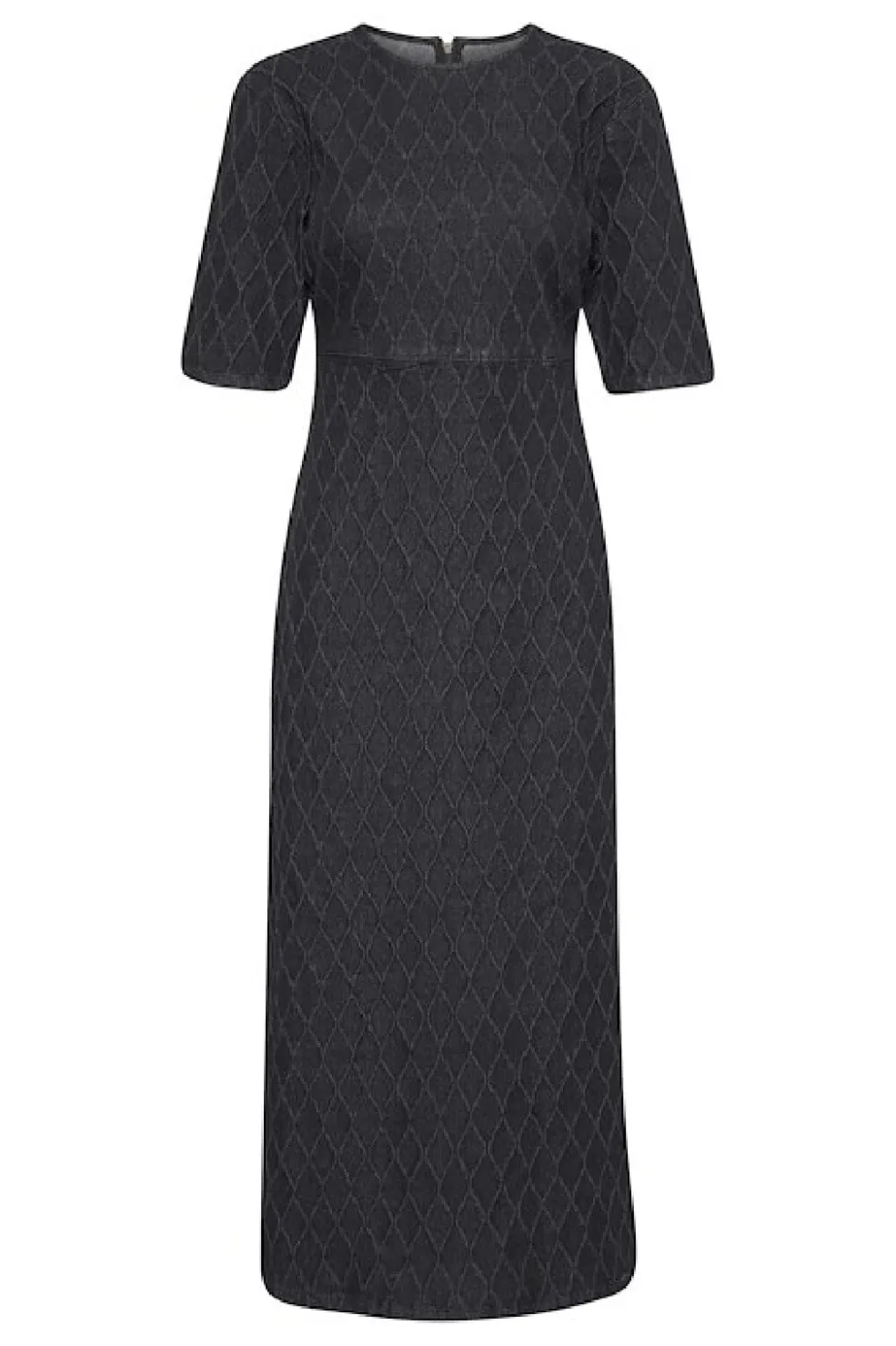 Lang kjole fra Gestuz i sort med diamantmønster. Kjolen har korte ærmer, rund hals og en slids i bunden.