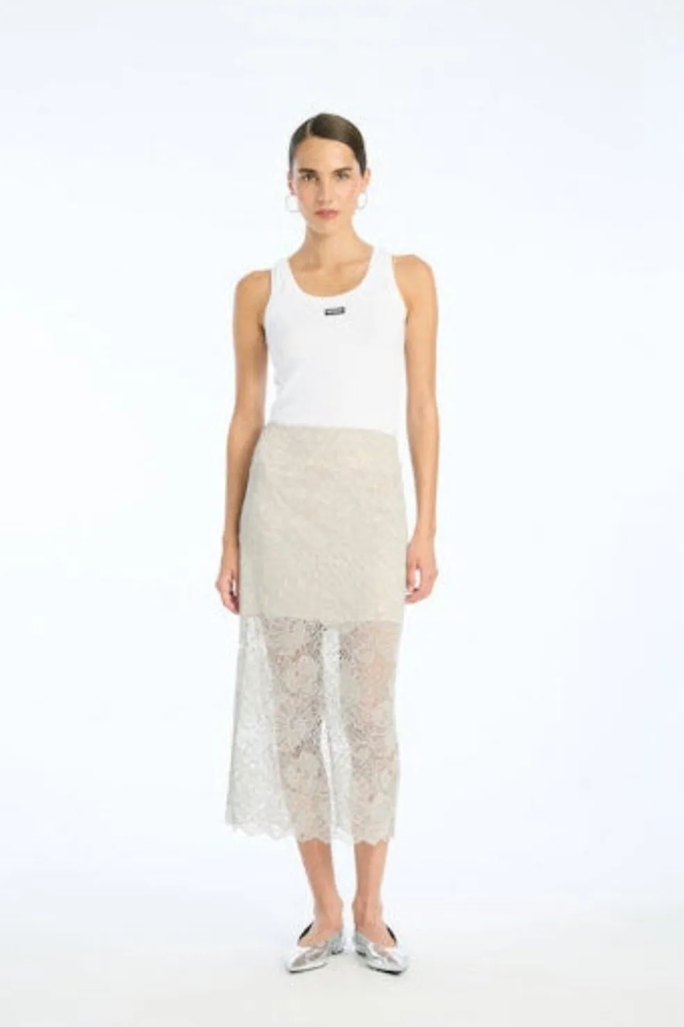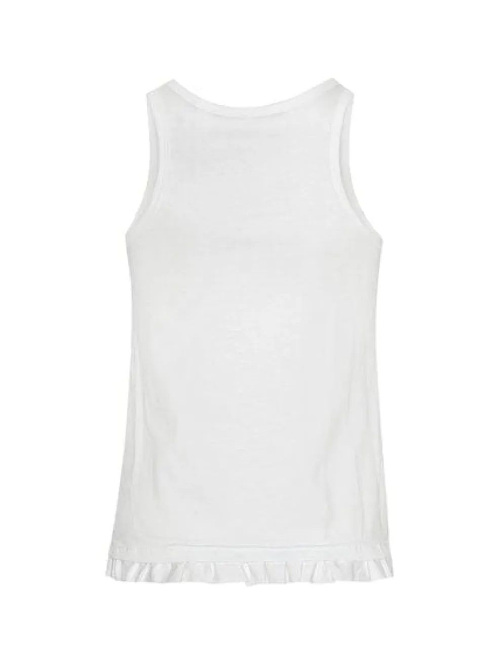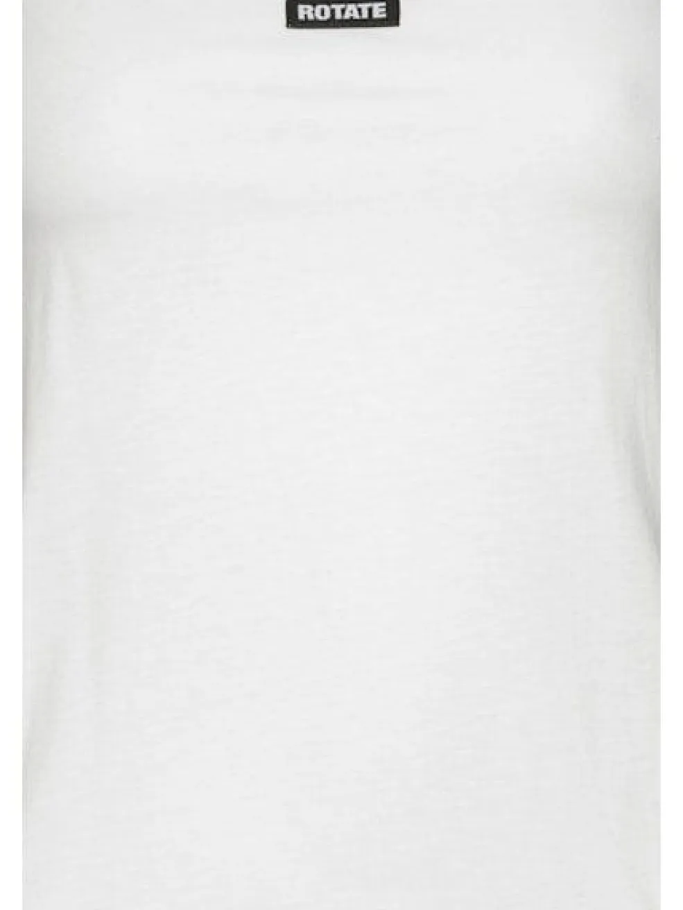 Hvid tanktop fra Rotate med rynket kant nederst. Toppen er ensfarvet og har et ROTATE-mærke på brystet. Den har et ærmeløst design.