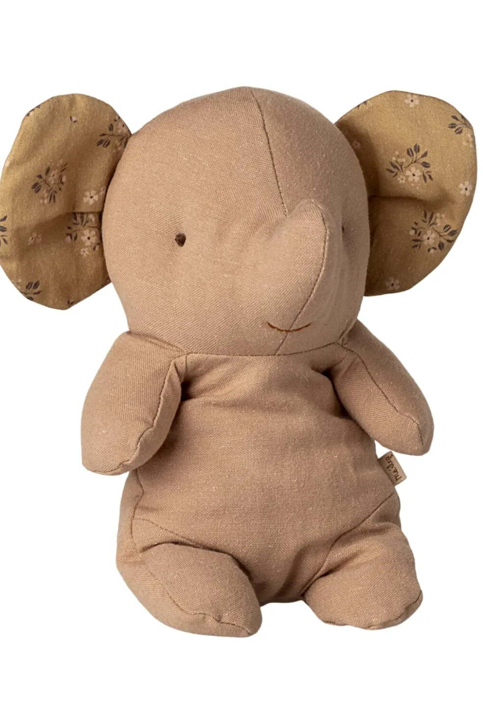 En lille elefant fra Maileg med en lysebrun krop og broderede ansigtstræk. Elefanten kan stå eller sidde selv og har blomsterprint på ørerne i forskellige farver.