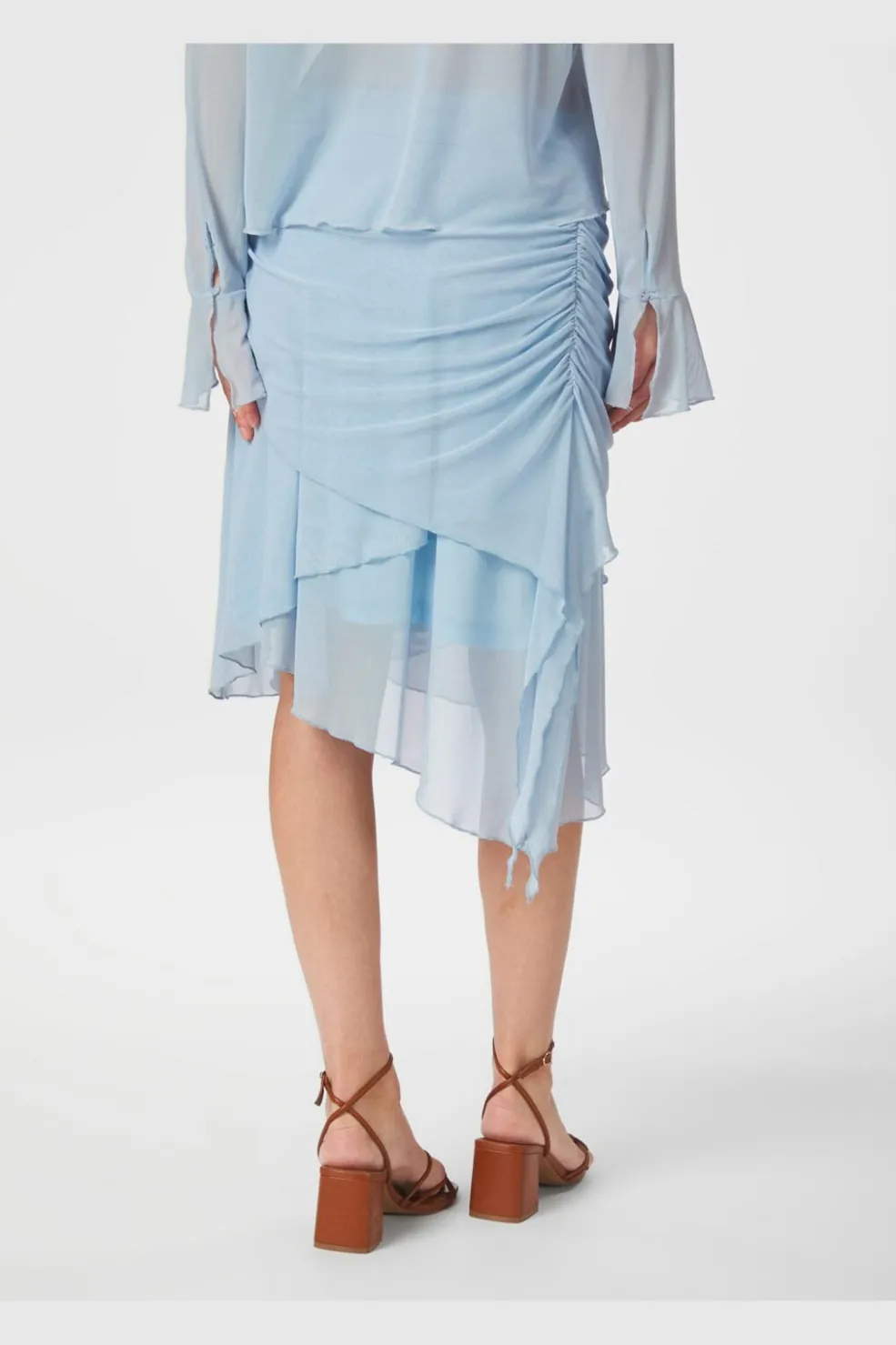 Lys blå mesh-nederdel fra Neo Noir med asymmetrisk snit. Nederdelen har flere lag stof, der falder i bløde folder, og en justerbar snøre i taljen.