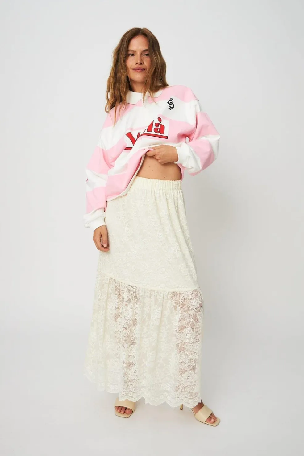 Hvidt ankellangt skørt fra Cras med blomstret blondemønster og flæsedetaljer. Skørtet har en elastisk talje med knapper og et lag af blonde i bunden.