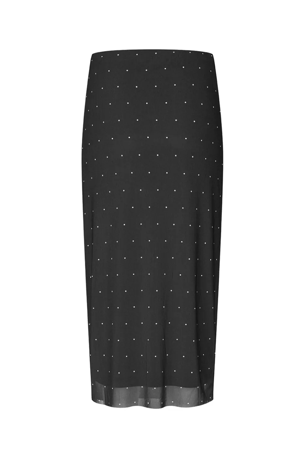 Sort nederdel med hvide prikker fra Modström. Lavet af genanvendt polyester med en transparent kant nederst. Den har en længde til læggene og elastisk lukning i taljen.