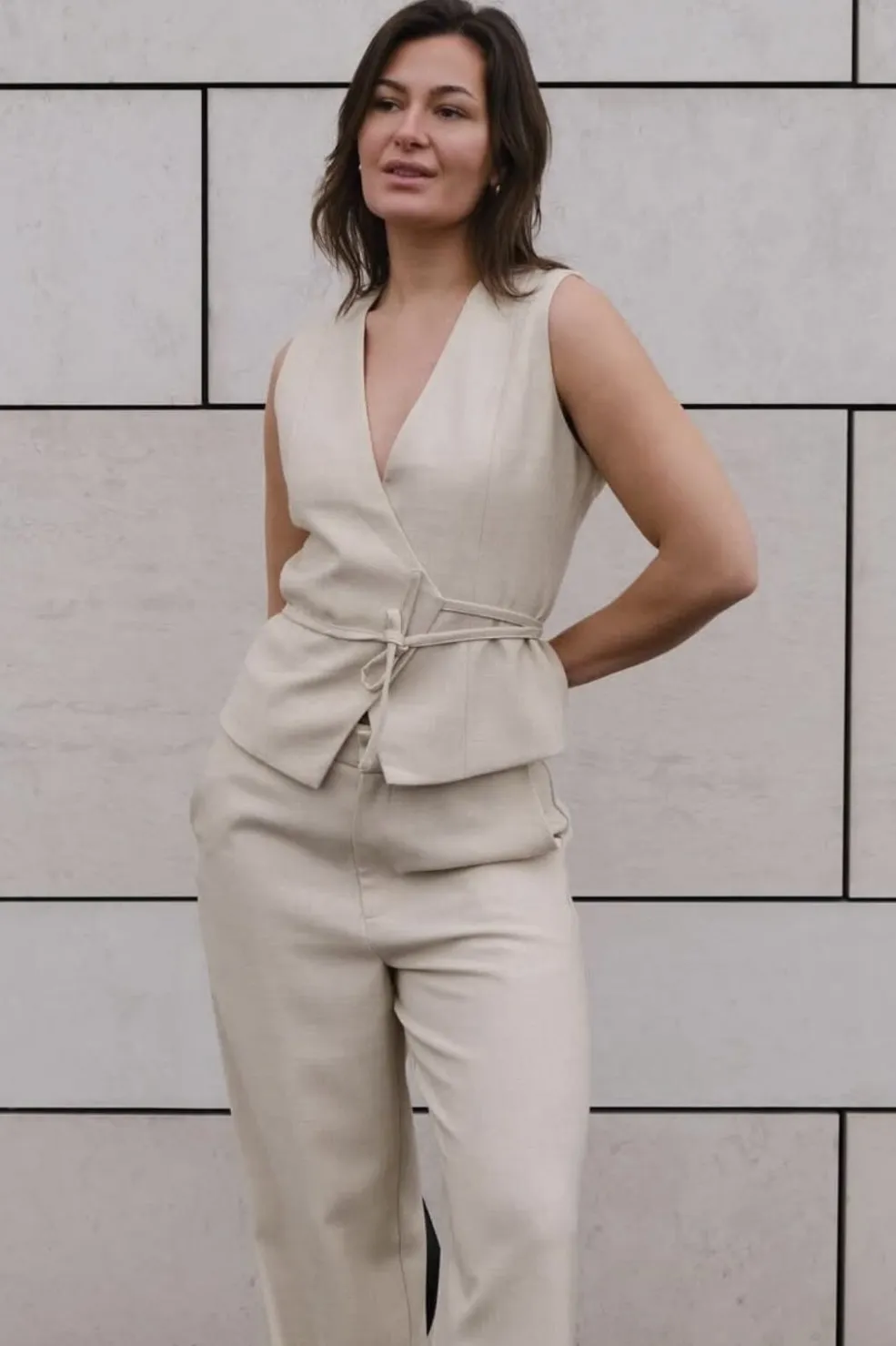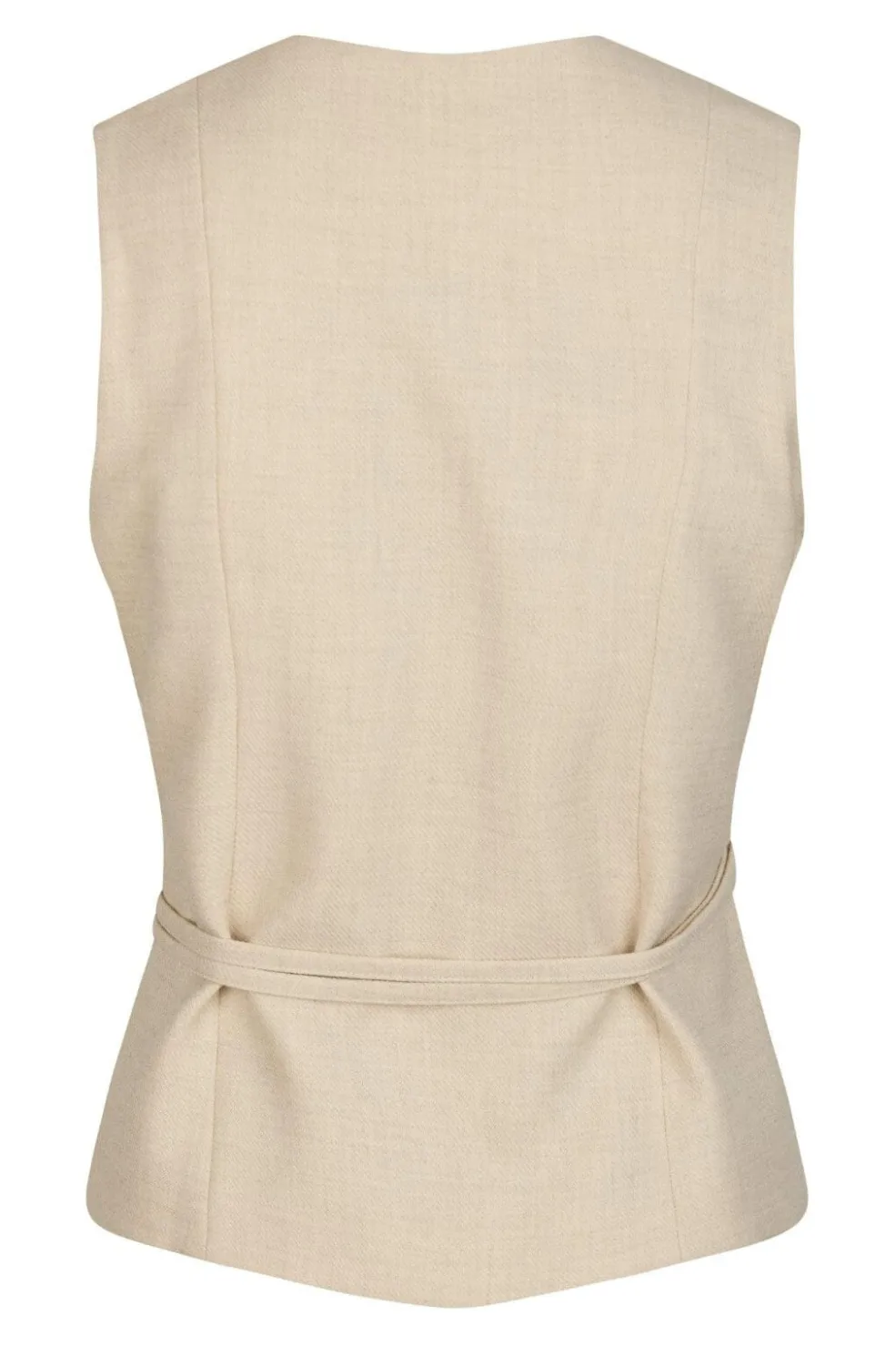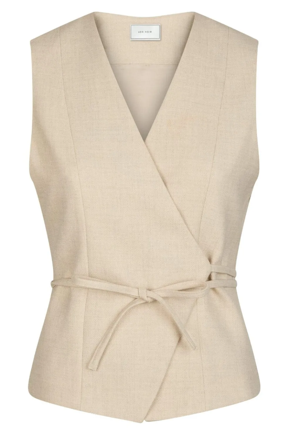 Beige melange vest med wrap-design og bindebånd i taljen. Den har V-udskæring og er ærmeløs med en meleret overflade, der giver dybde til stoffet.