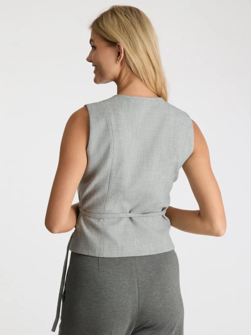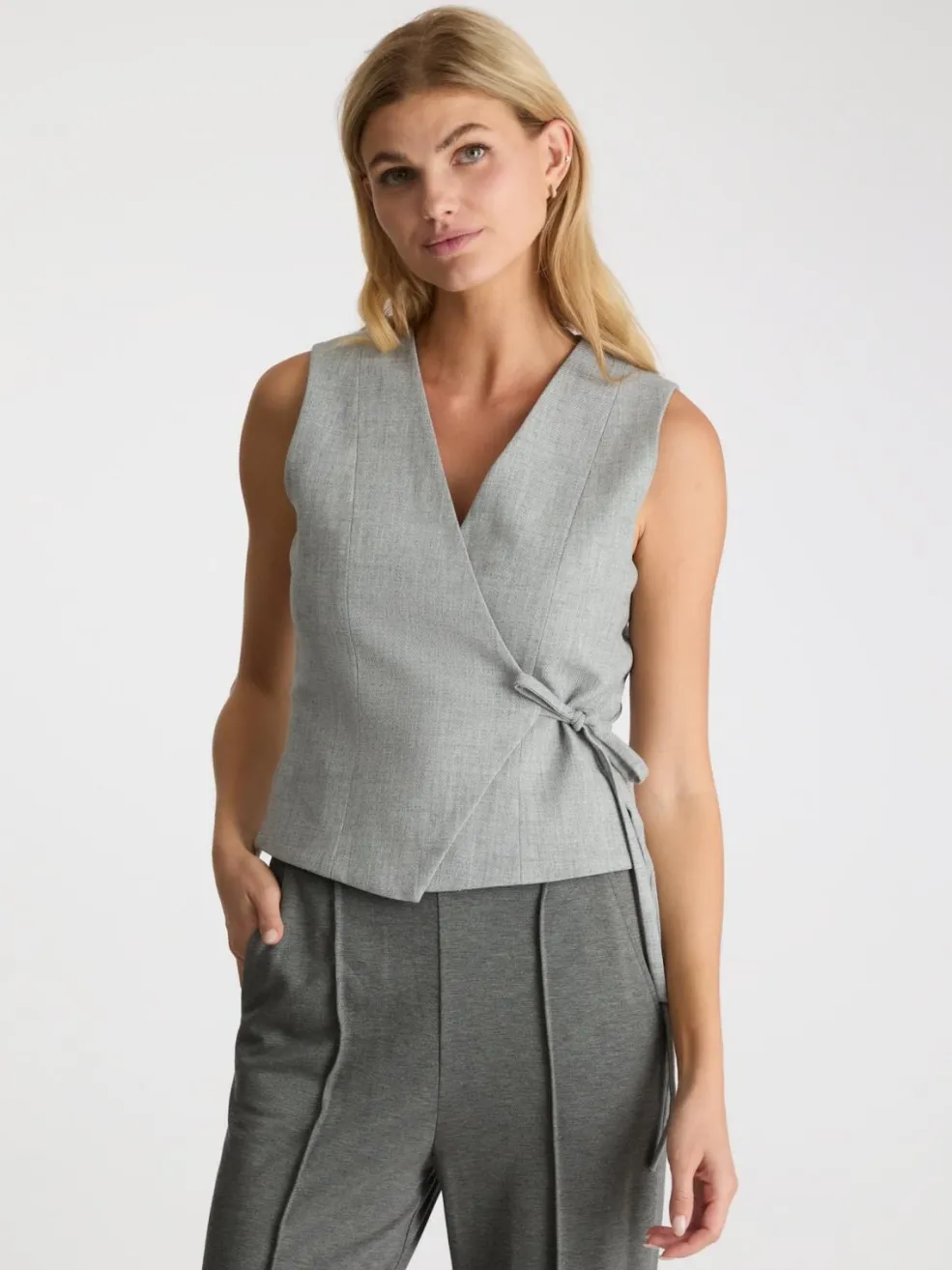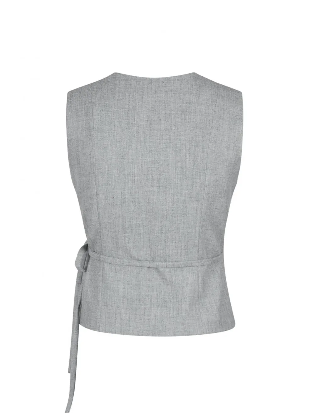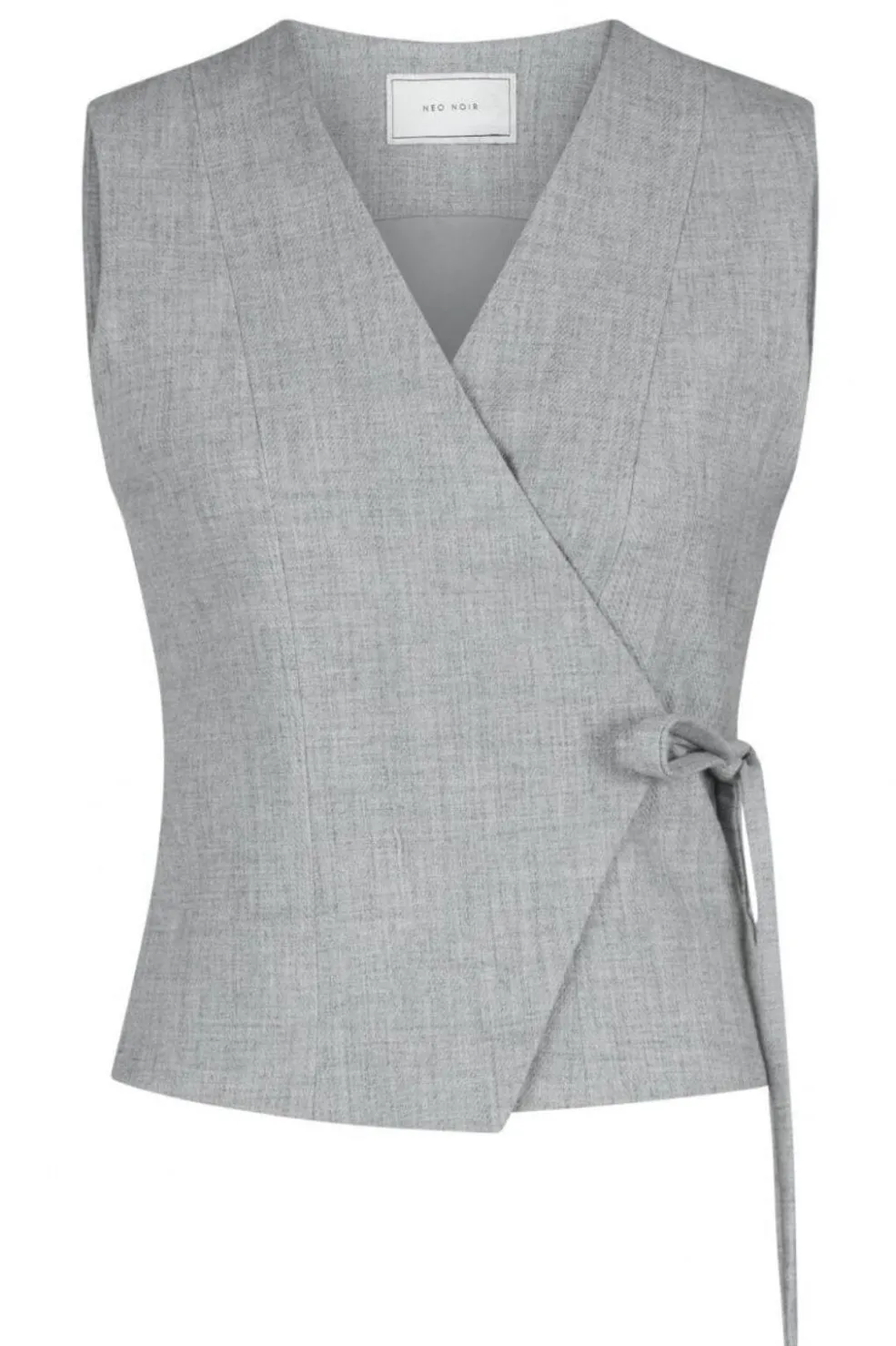 Grå vest fra Neo Noir med wrap-design og bindebånd i taljen. En ærmeløs model med V-udskæring, der kan bruges til både arbejde og fest.