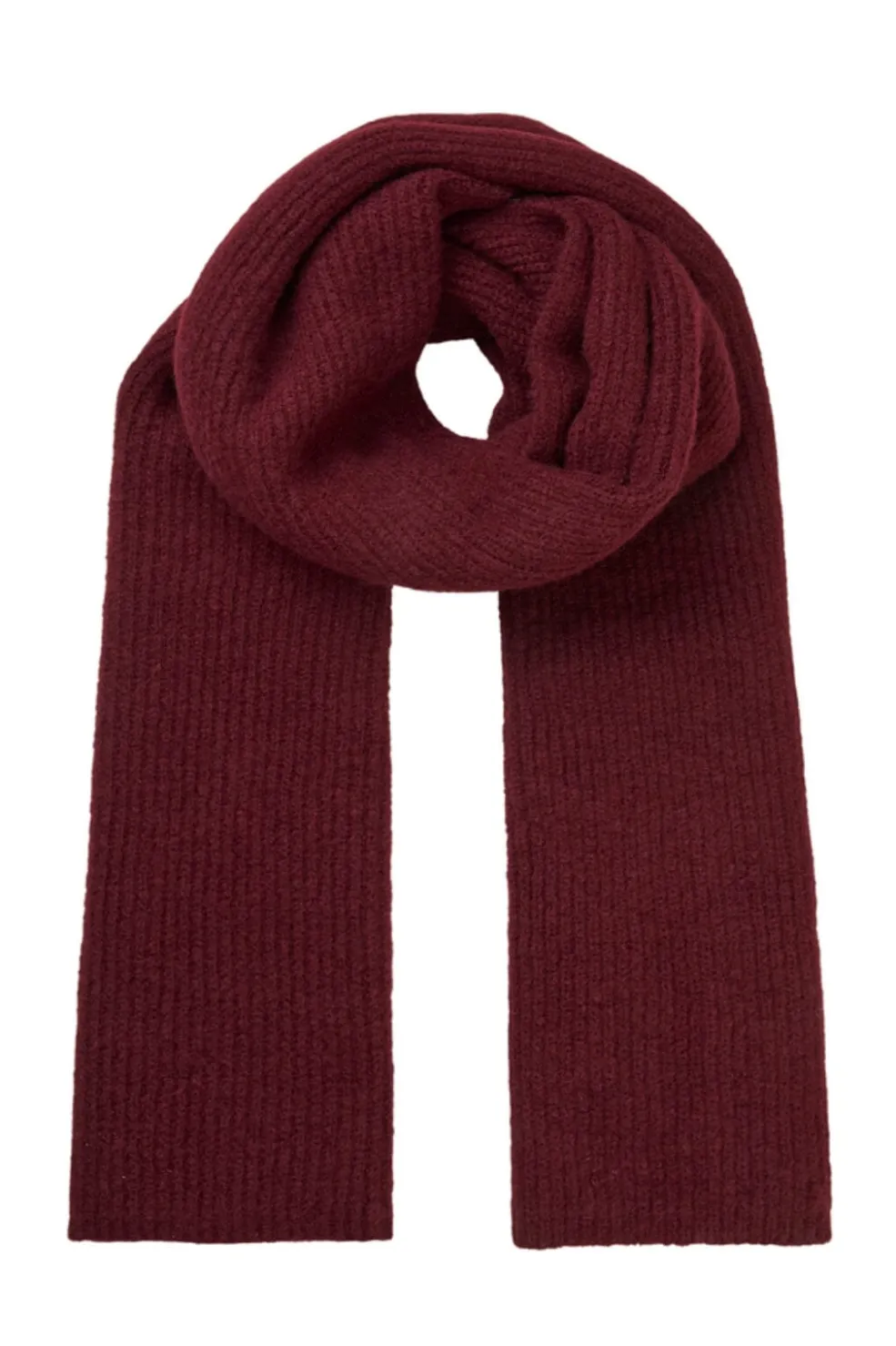 Et tørklæde fra MbyM i en mørk rød fig melange-farve. Tørklædet har et bredt ribbet mønster og er strikket i et tykt materiale.