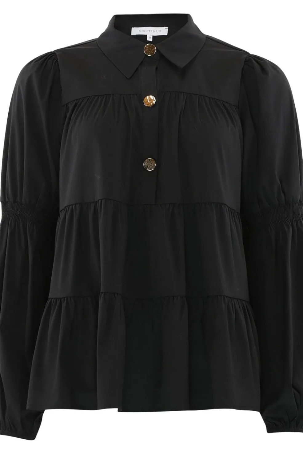 Sort bluse fra Continue med skjortekrave og guldknapper langs midten. Blusen har en løs pasform og lange ærmer med samlet stof ved håndleddene.