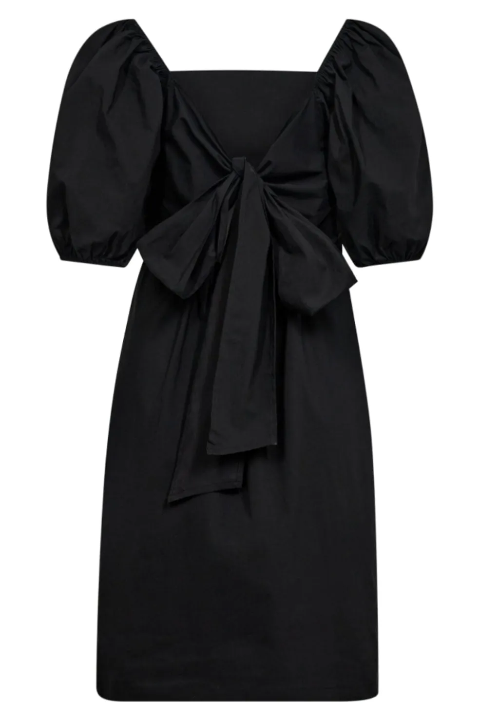 Sort kjole fra Co’Couture med firkantet udskæring og puffærmer. Kjolen har en knudedetalje ved taljen og går til knæene. Den sorte farve gør den nem at style.