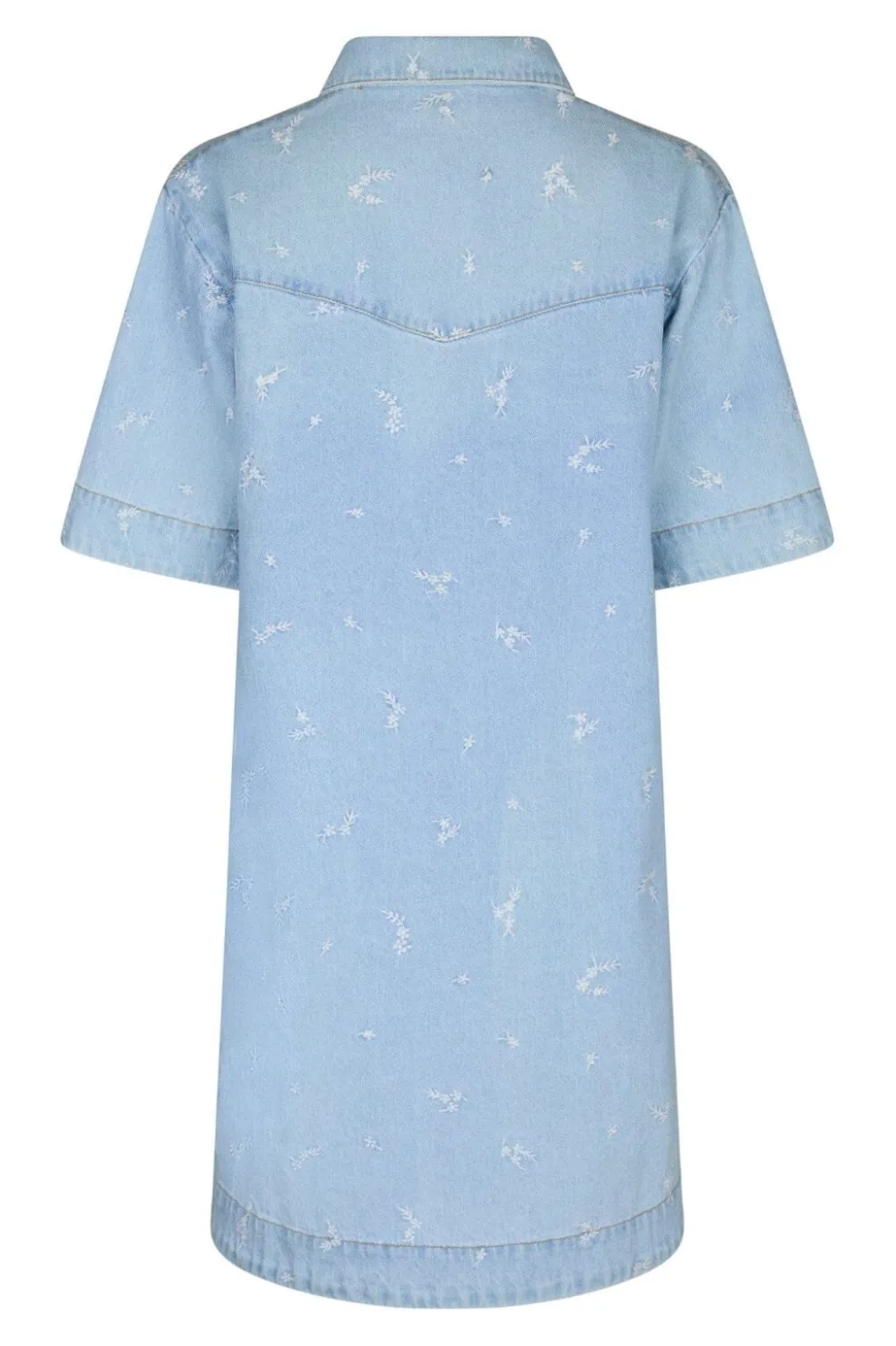 Lys blå denimkjole fra Neo Noir med broderede blomstermotiver. Kjolen har en skjortekrave, korte ærmer og to brystlommer i et klassisk denimdesign.