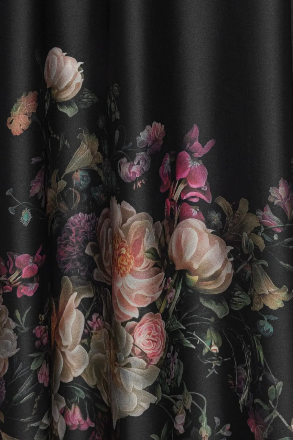 Sort lang nederdel fra Karmamia med blomstermønster. Den har lyserøde og cremefarvede blomster langs kanten på en sort baggrund. Stoffet har en blød, satinagtig overflade.