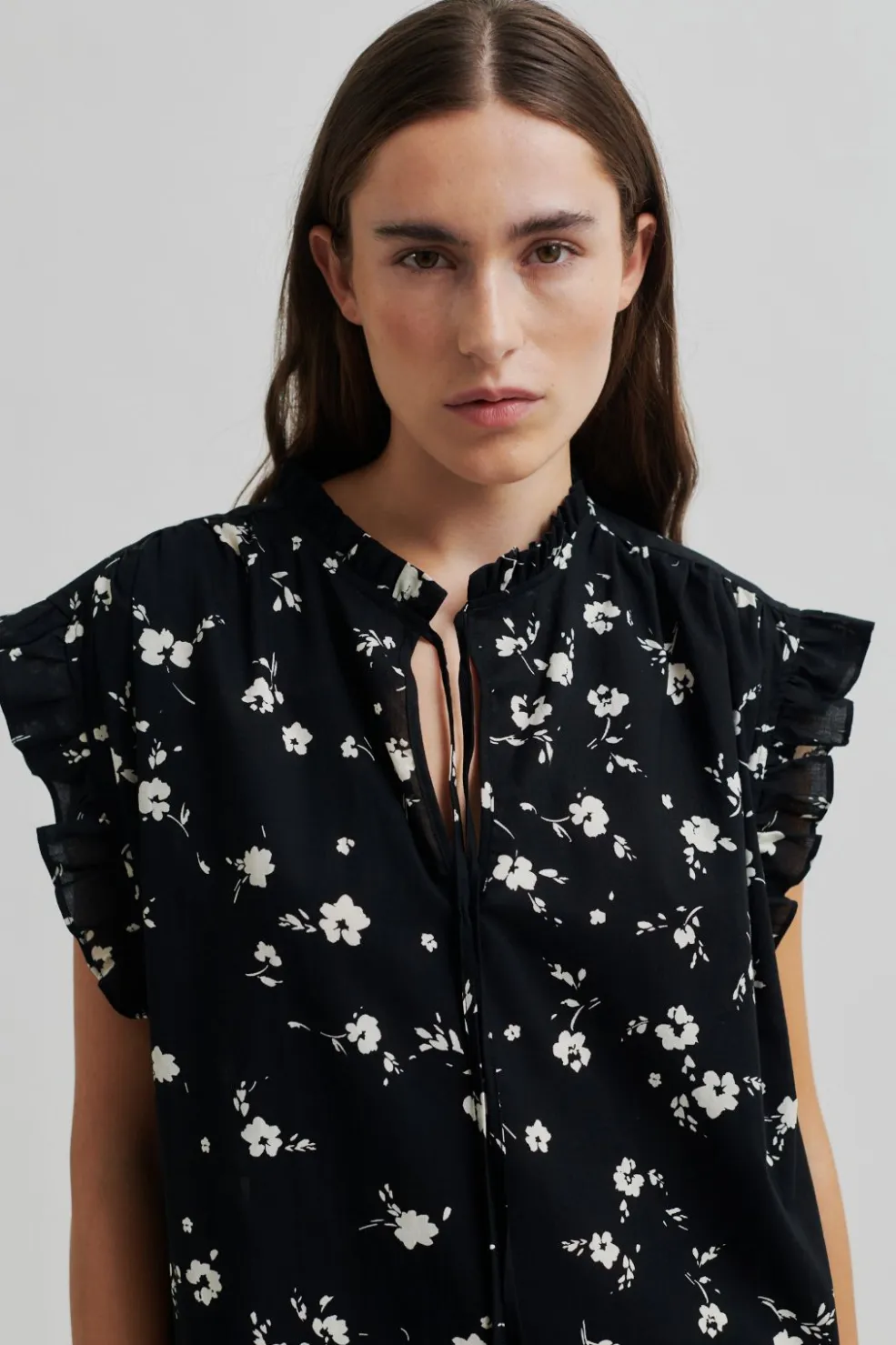 Sort kjole fra Second Female med hvidt blomstermønster. Den har høj hals med snorelukning og flæser ved ærmerne. Kjolen går til låret og har en løs pasform.