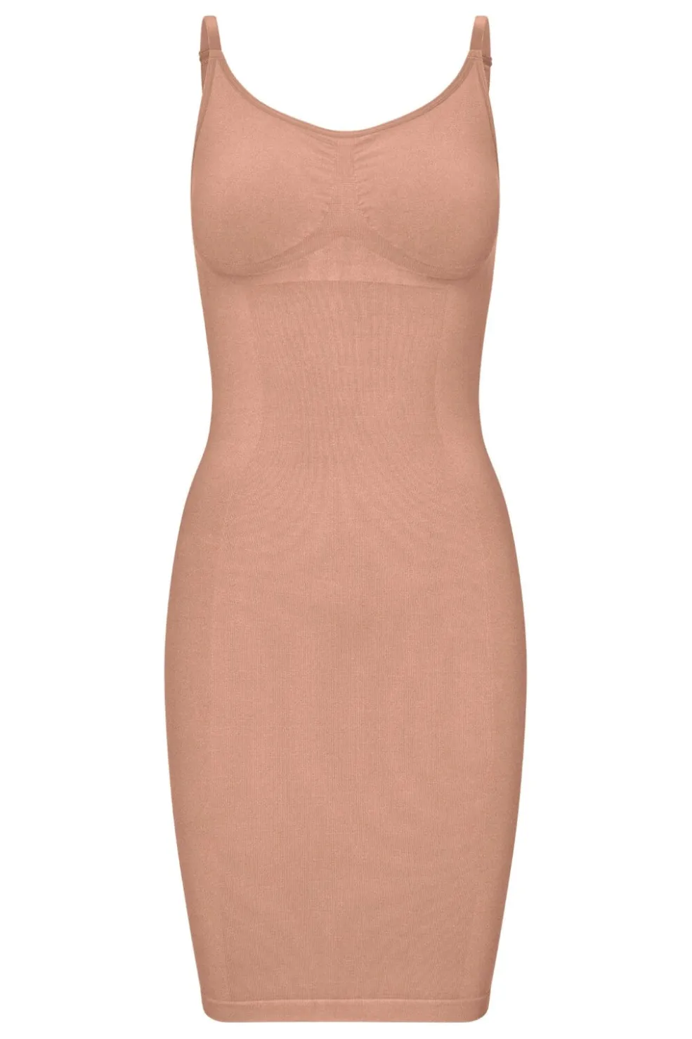 Beige slipkjole fra Lykkeland Ateliér med tynde stropper. Kjolen har en kropsnær pasform og er lavet i strækbart stof, der følger kroppens form.