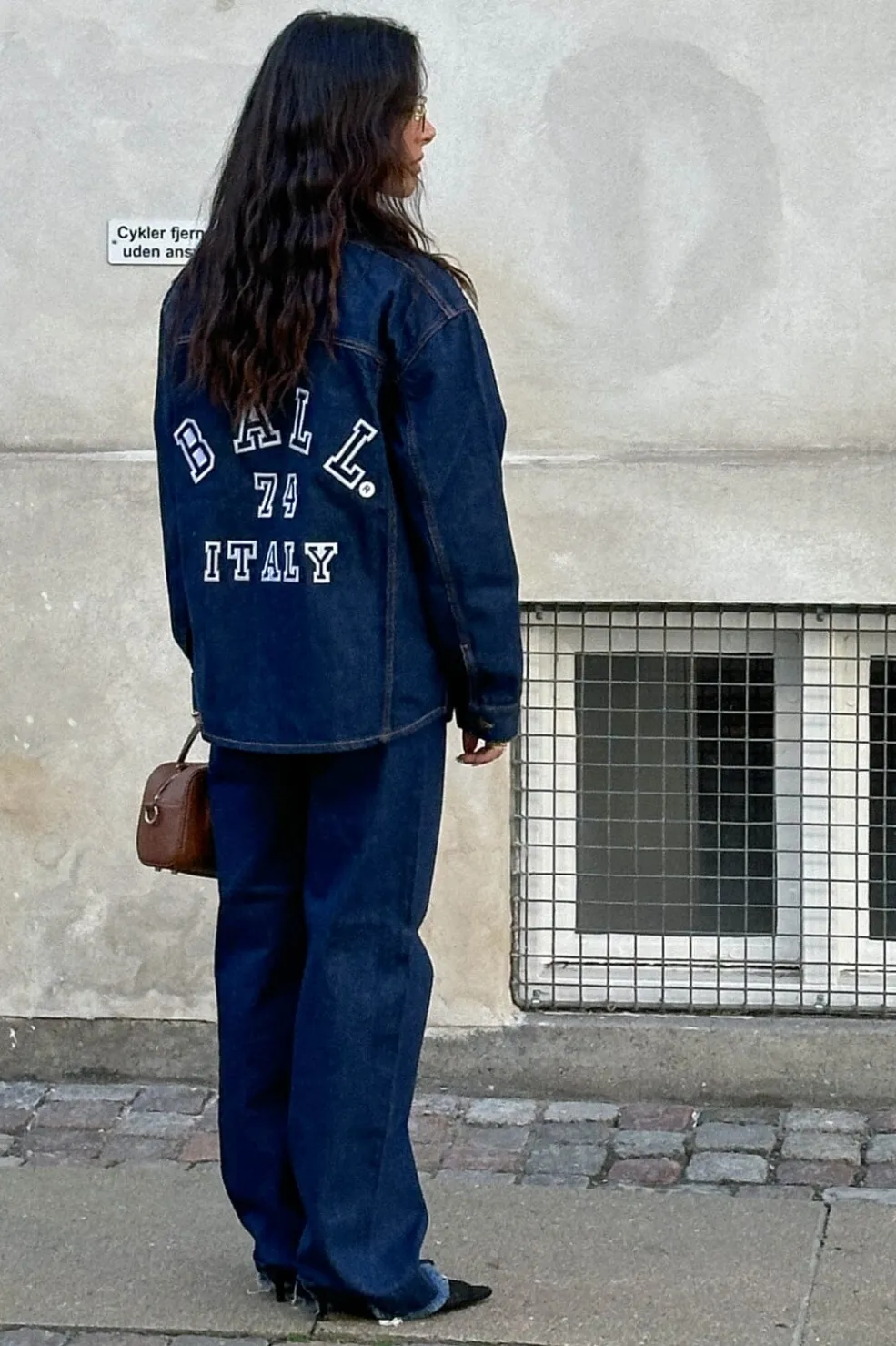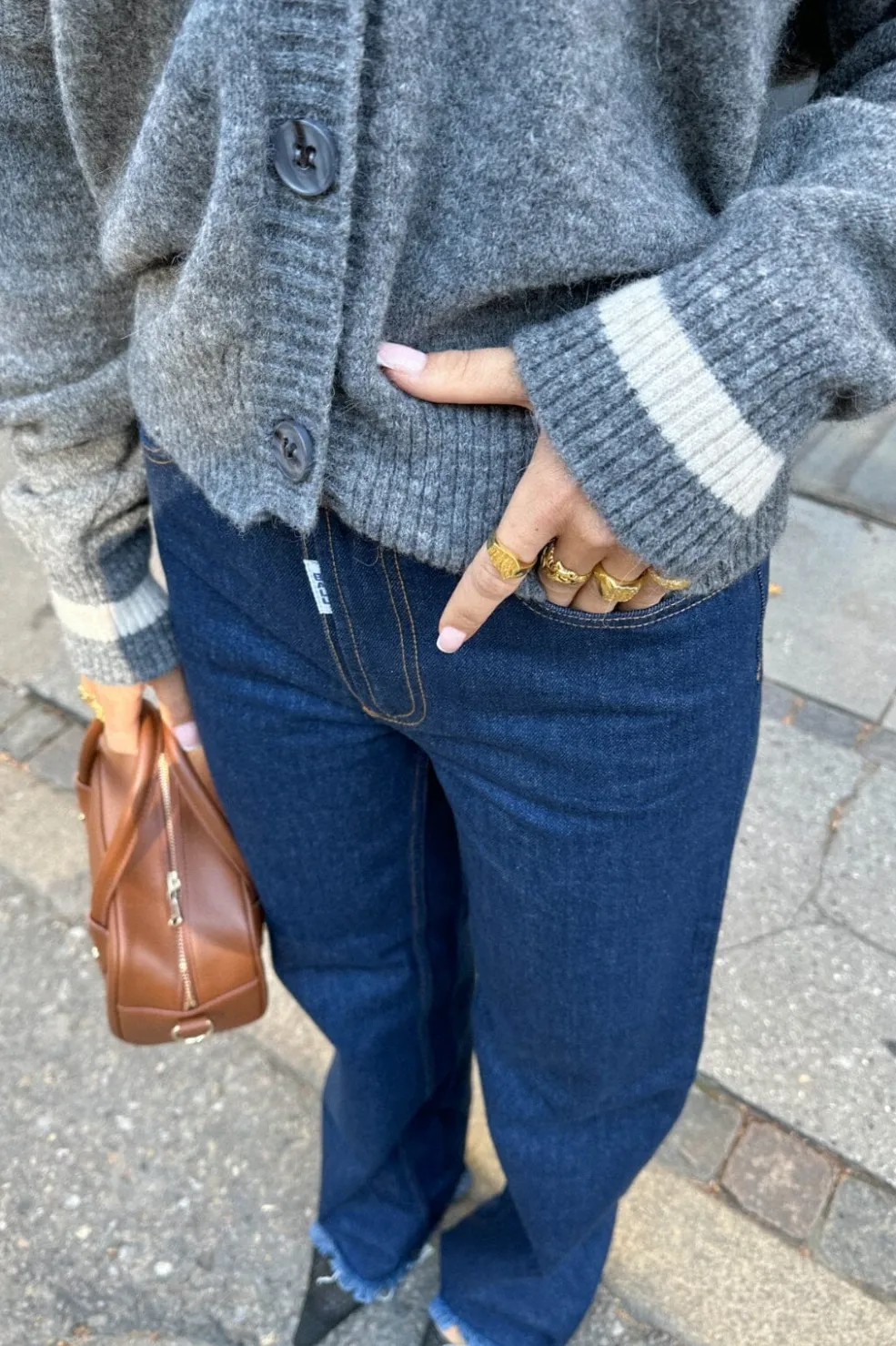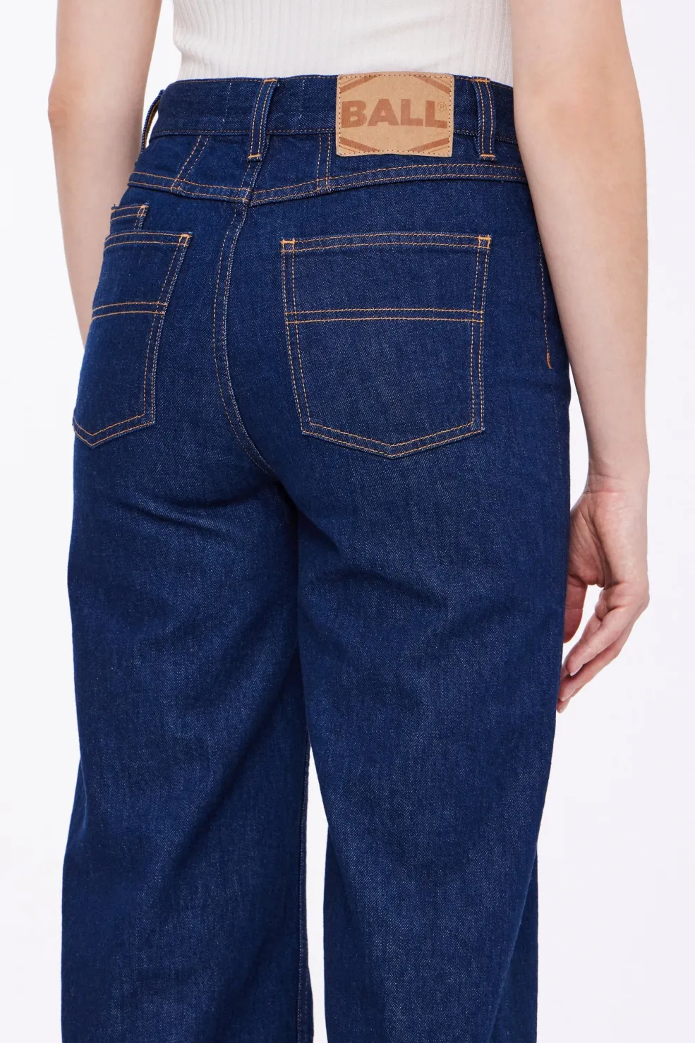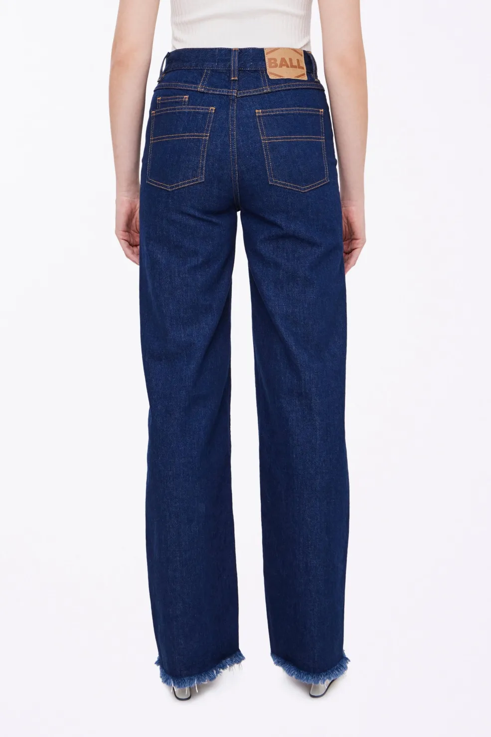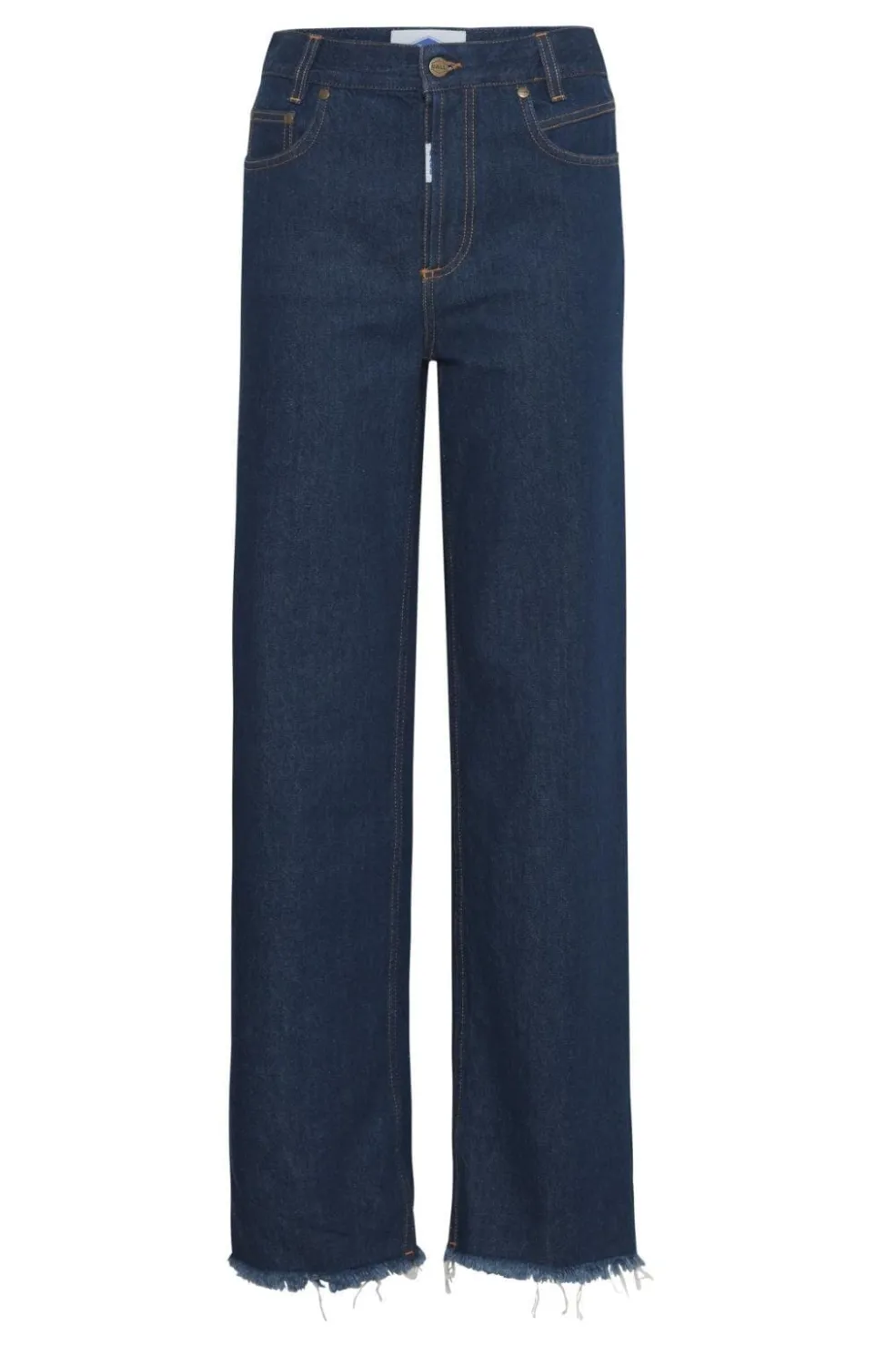 Jeans fra Ball i mørkeblå rinse wash. Bukserne har vide ben med frynsede kanter nederst og dekorative syninger på lommerne.