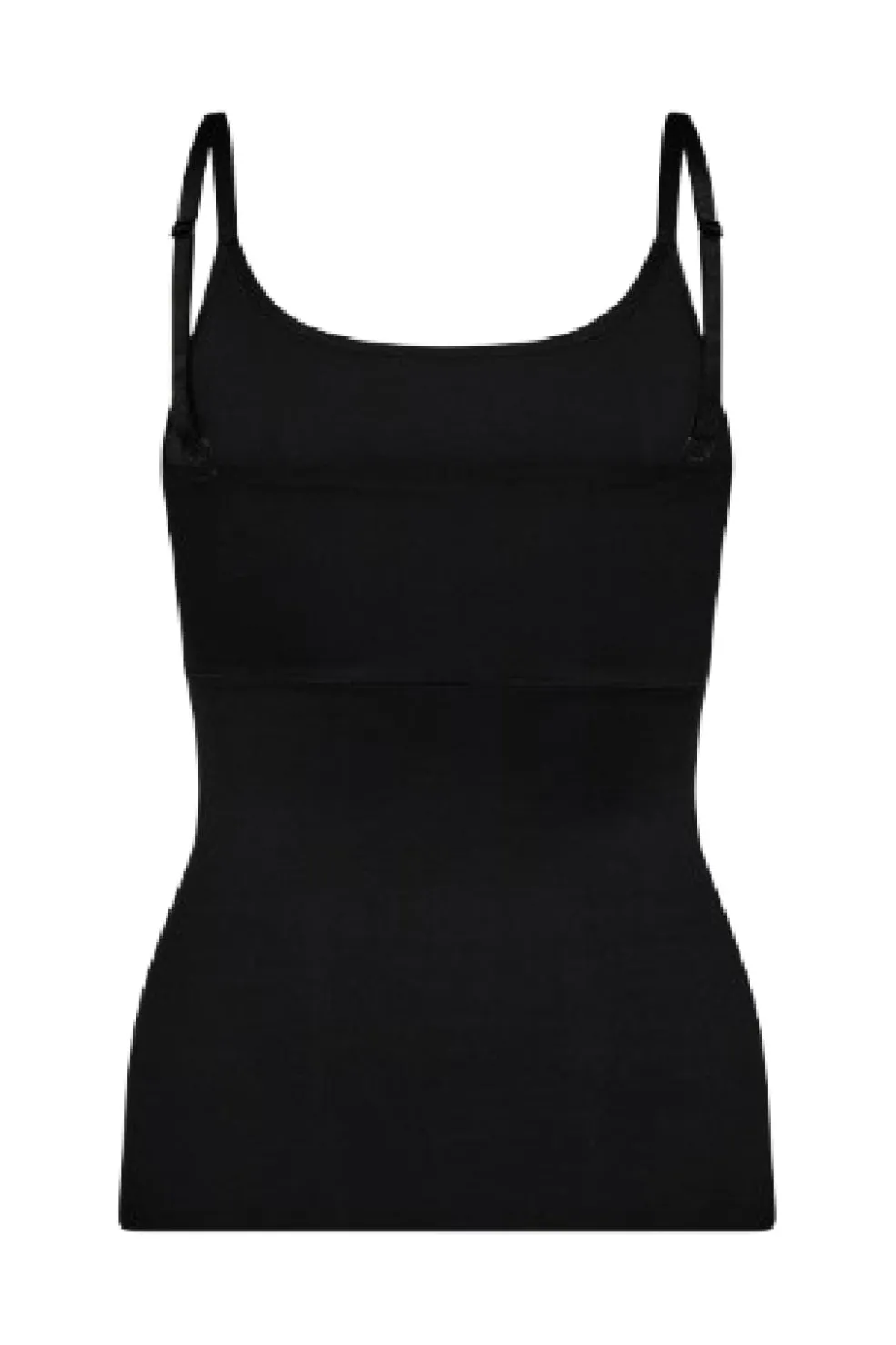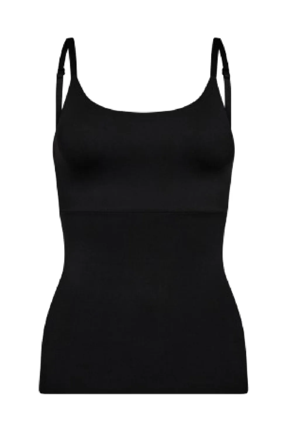 Sort shapewear-top fra Decoy med spaghetti-stropper og sømløst design. Toppen har en tætsiddende pasform og rund halsudskæring.
