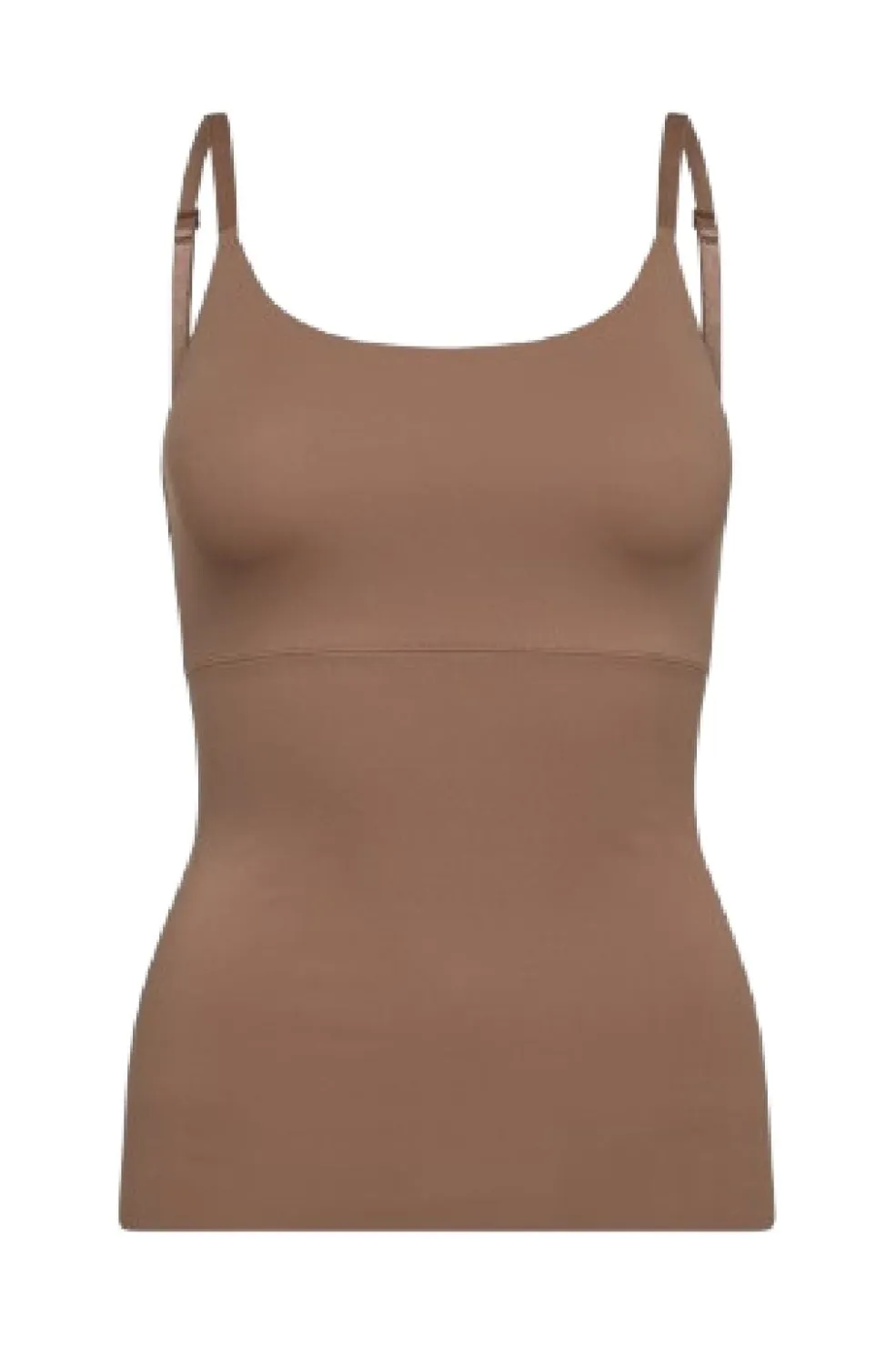 Brun shapewear-top fra Decoy med glat, sømløs overflade og tynde, justerbare stropper. Toppen har en tætsiddende pasform og en rund halsudskæring.