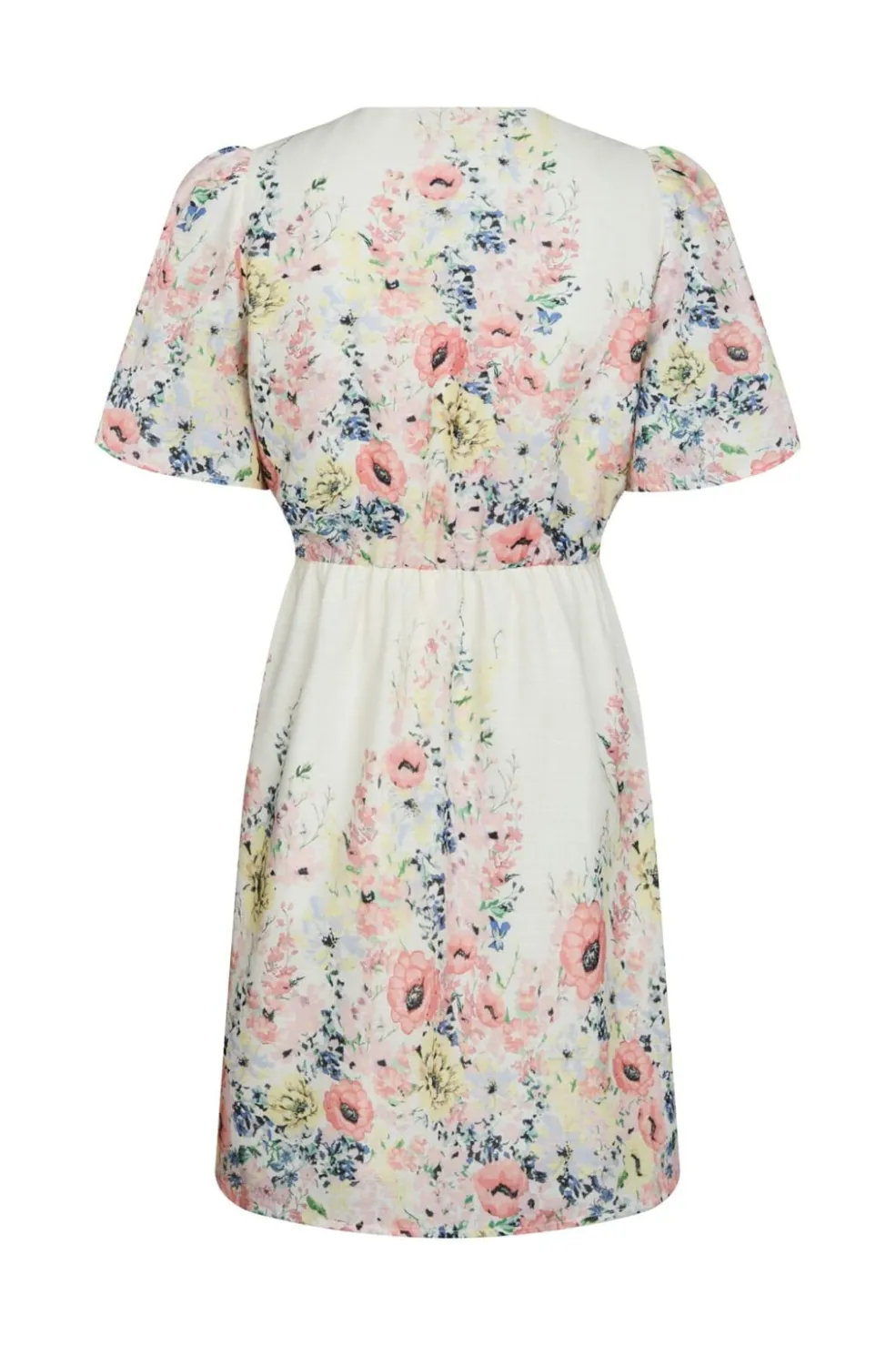 Cremefarvet kjole fra Neo Noir med blomsterprint i rosa, gul og blå. Kjolen har flæsedetaljer og en dyb V-udskæring, der giver den et sommerligt udtryk.
