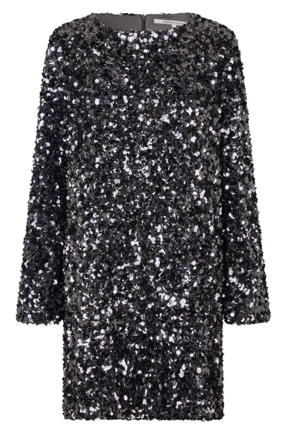 Kort kjole fra Second Female med pailletter i grå og sølvnuancer. Kjolen er lavet af 100% polyester og har en løs pasform.