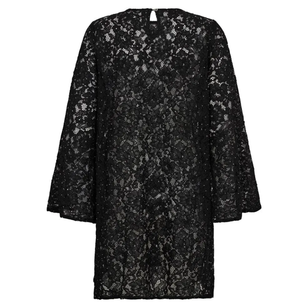 Sort blondekjole fra Co’Couture med blomstermønster og pailletter. Kjolen har 3/4-ærmer, rund hals og en løs pasform, der går til midt på låret.