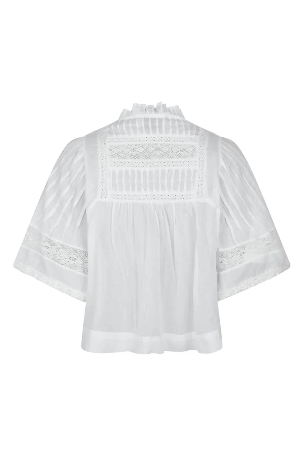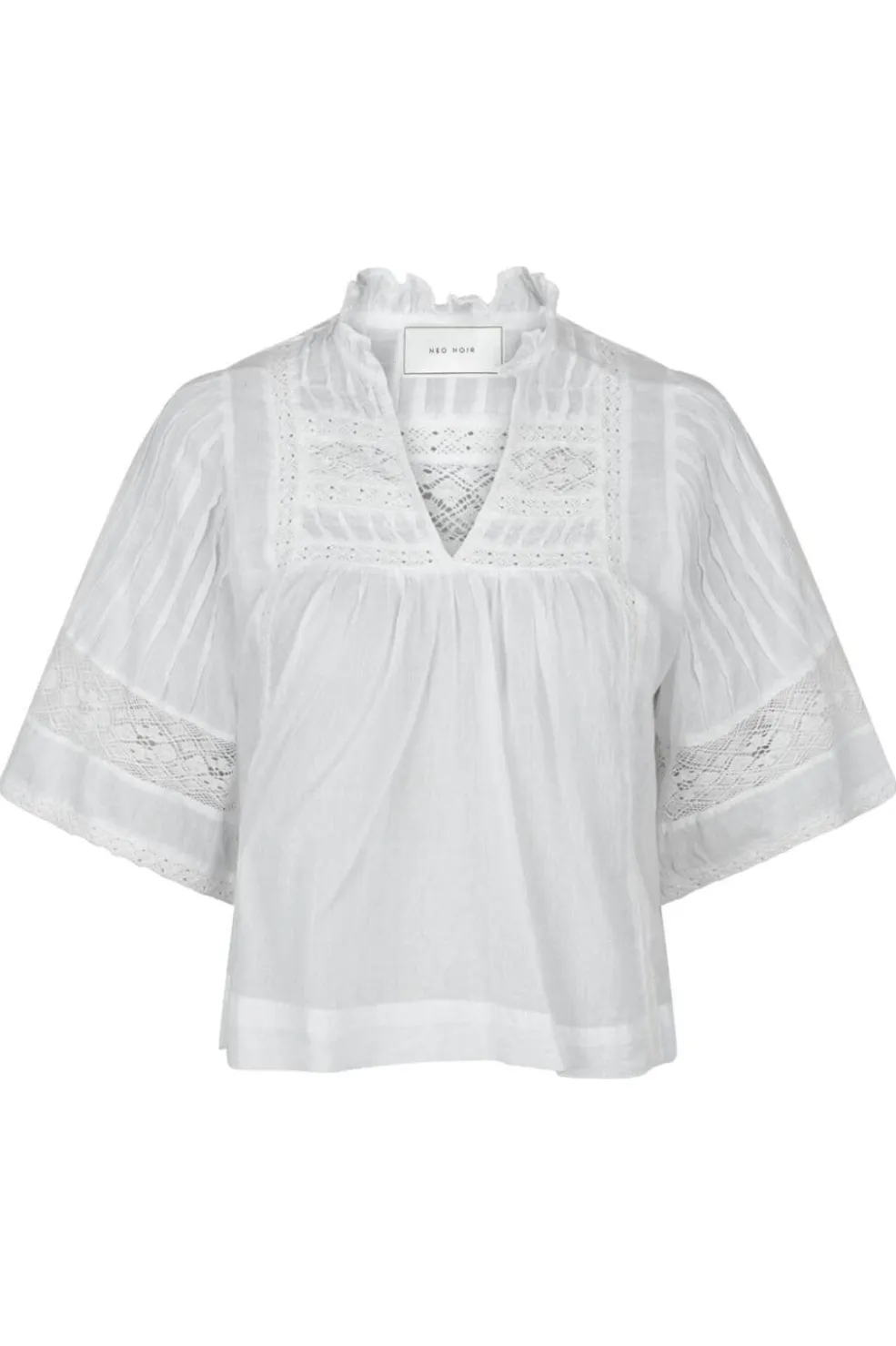 Hvid voile-bluse fra Neo Noir med V-halsudskæring og løs pasform. Blusen har blondedetaljer og dekorative syninger, der giver et feminint udtryk.
