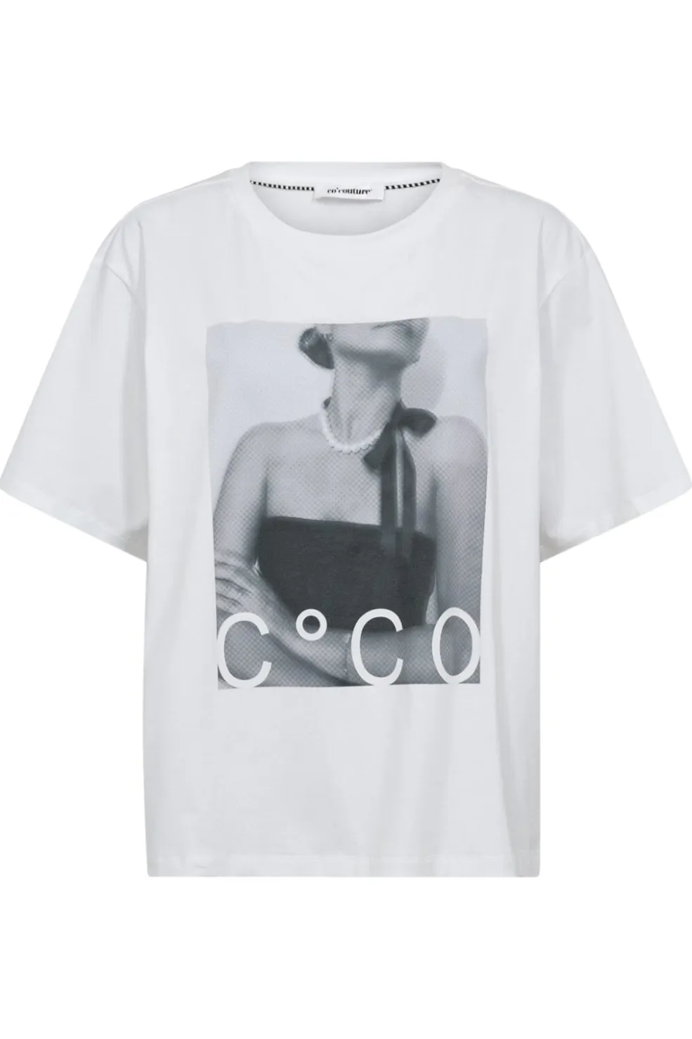 Hvid t-shirt fra Co´Couture med et sort-hvidt fotoprint på forsiden. Printet viser en figur med perlekæde og sløjfe sammen med brandingteksten c°c.