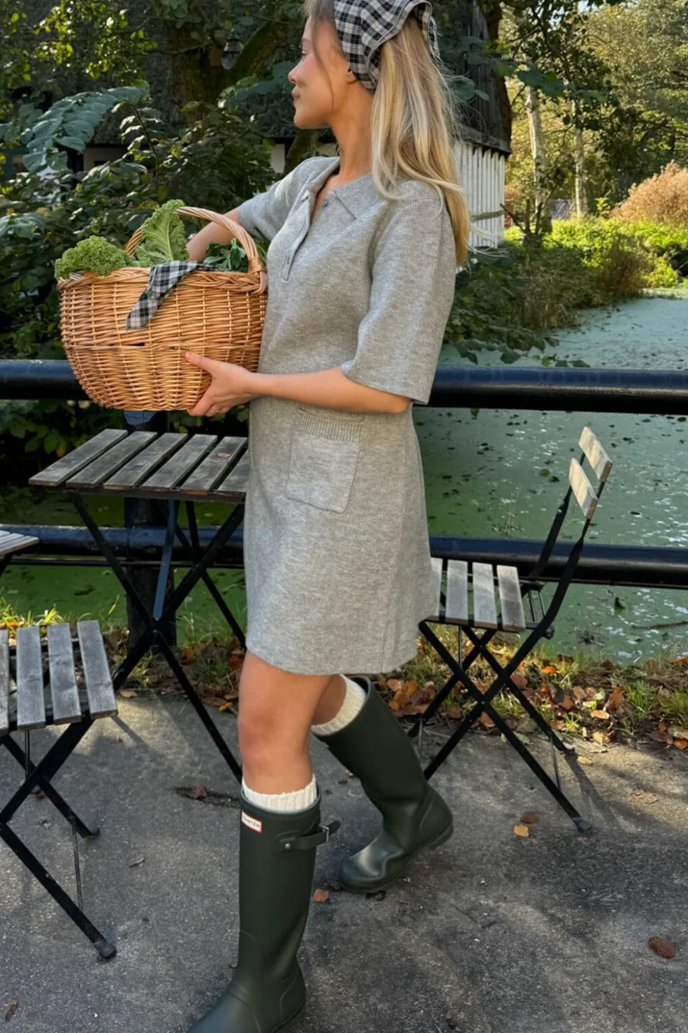 Grå strikket kjole fra BYIC med polokrave og korte ærmer. Kjolen har en lige silhuet og går til midt på låret.
