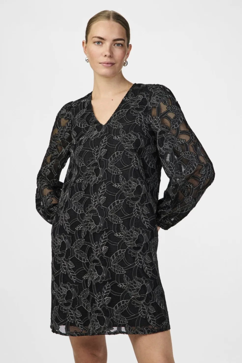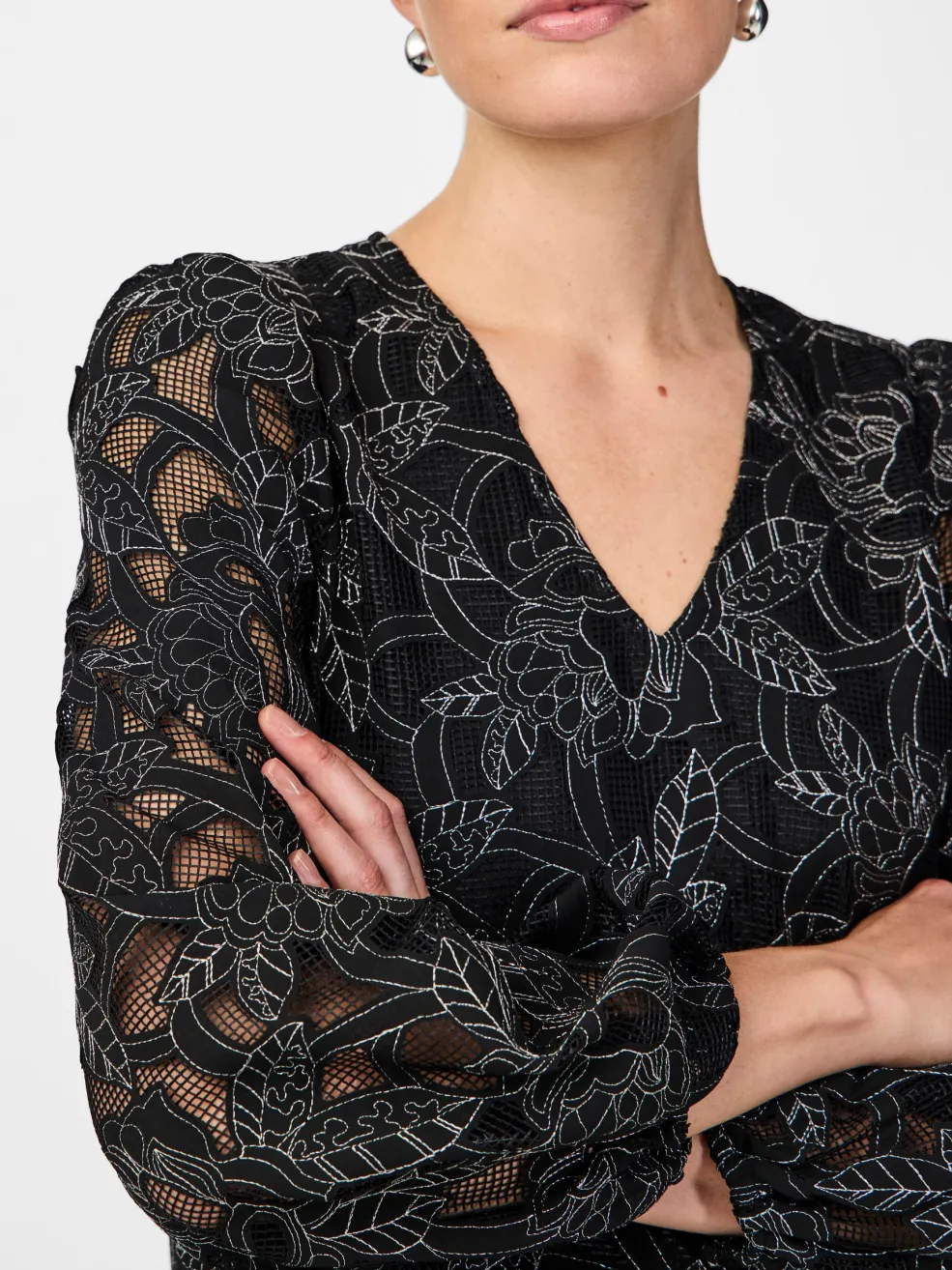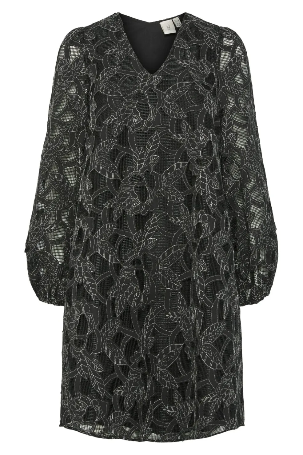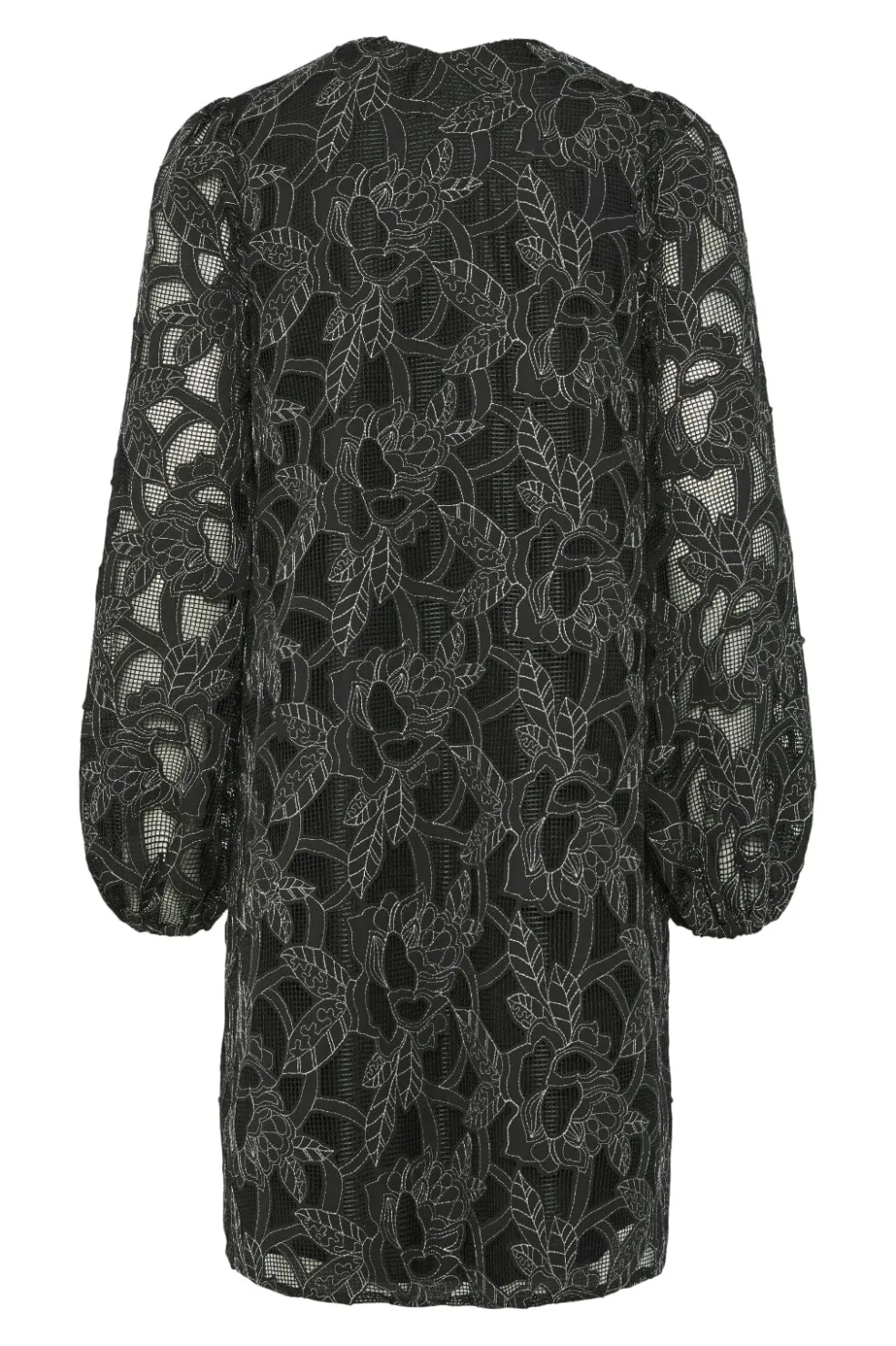 Sort kjole fra Y. A.S med blondemønster og blomster. Kjolen har en V-halsudskæring og lange pufærmer med sølvfarvede syninger, der skaber kontrast til den sorte base.