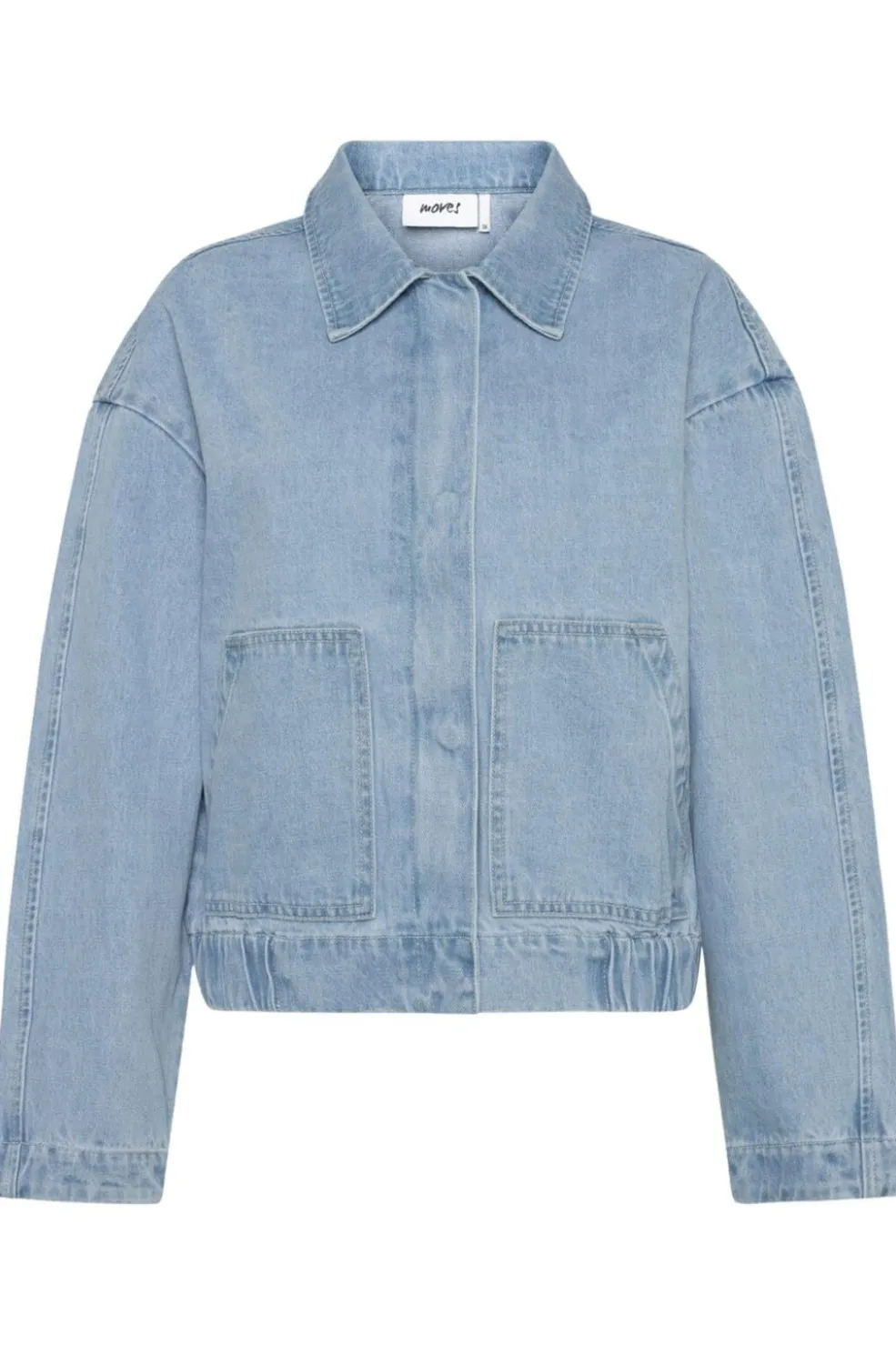 Lys blå denimjakke fra Moves by Minimum med cropped design. Jakken har skjortekrave, knaplukning og to store frontlommer. Den korte længde og den lyse farve giver et friskt udtryk.