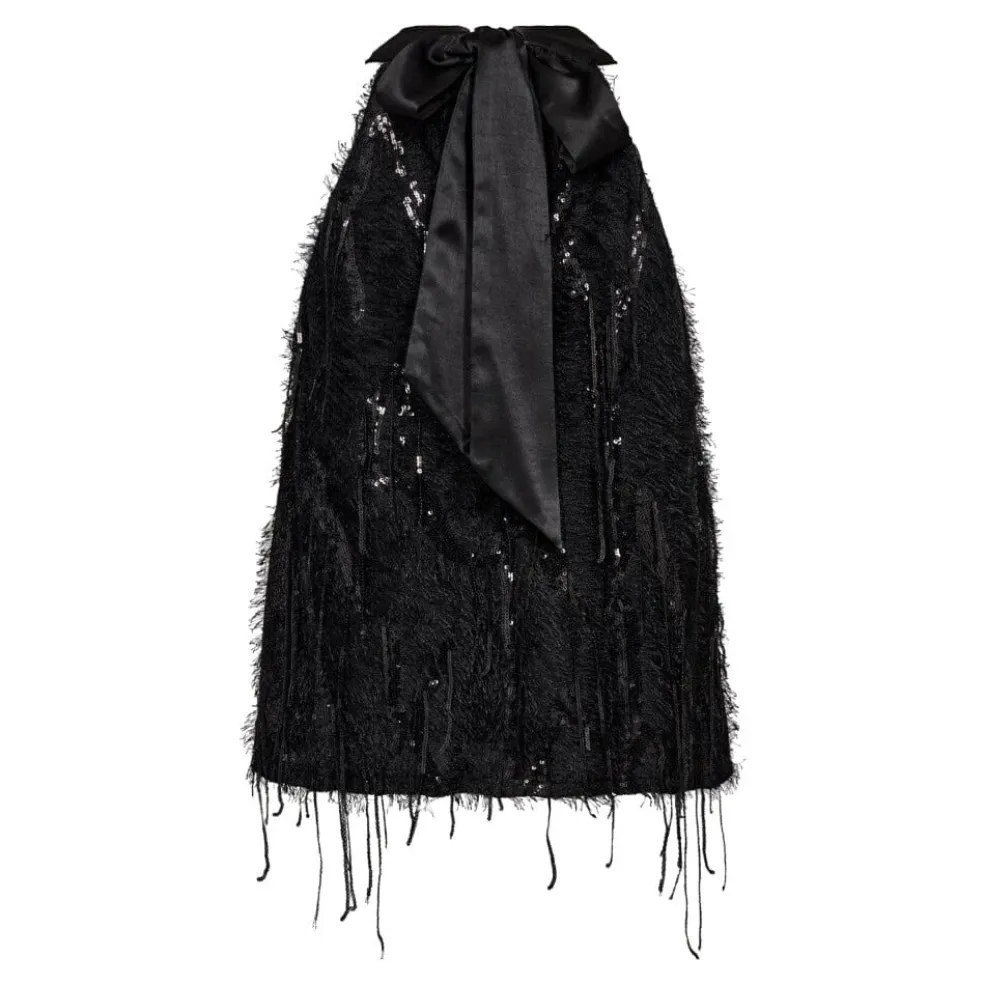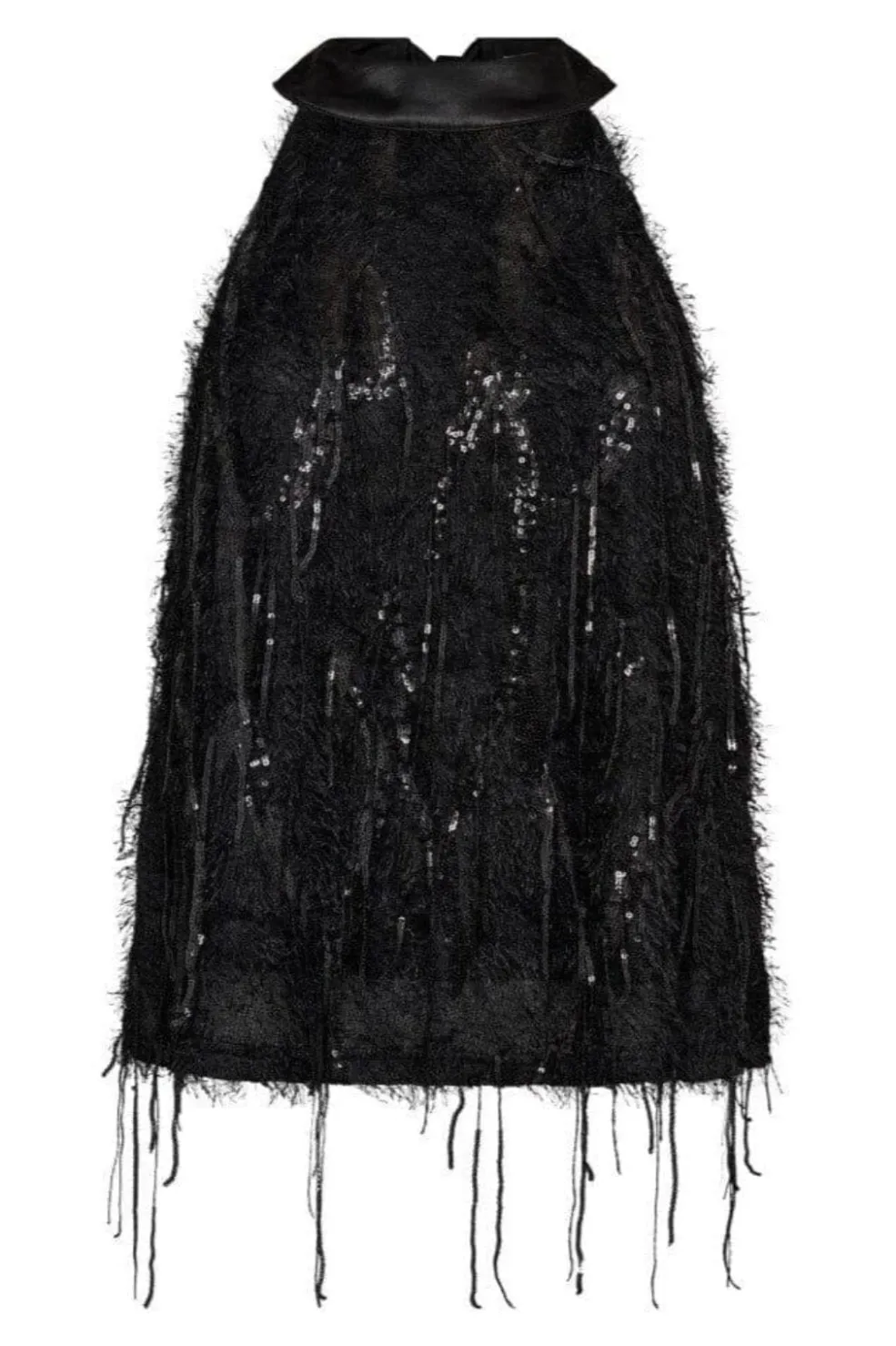 Sort haltertop fra Co’Couture med høj hals og frynser. Toppen har pailletter og en struktureret overflade, der giver et festligt udtryk.