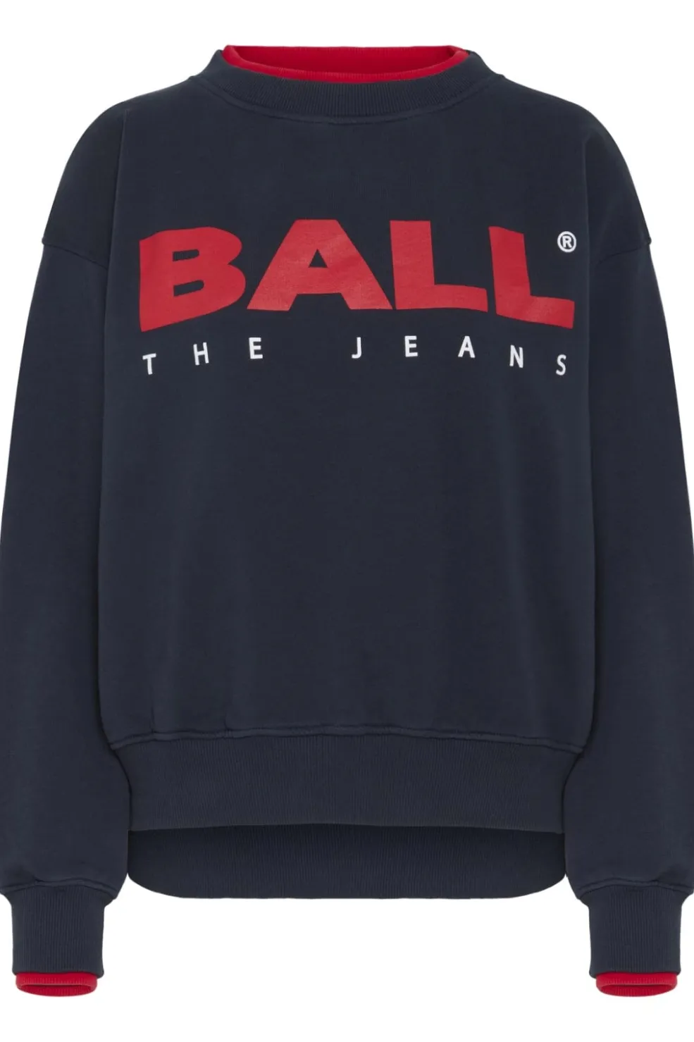 Navyblå sweatshirt fra Ball med røde detaljer ved halsen og ærmerne. Den har et stort rødt BALL-logo på fronten med teksten THE JEANS under.