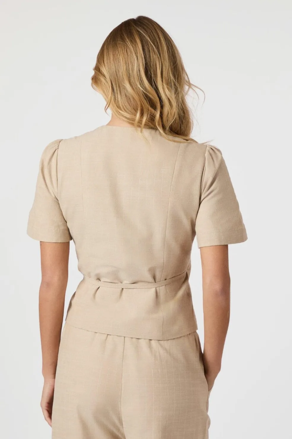 Sandfarvet slå-om-bluse fra Neo Noir med stribedetaljer. Blusen har korte pufærmer og en V-udskæring. Bindebåndet i siden giver mulighed for at tilpasse pasformen.