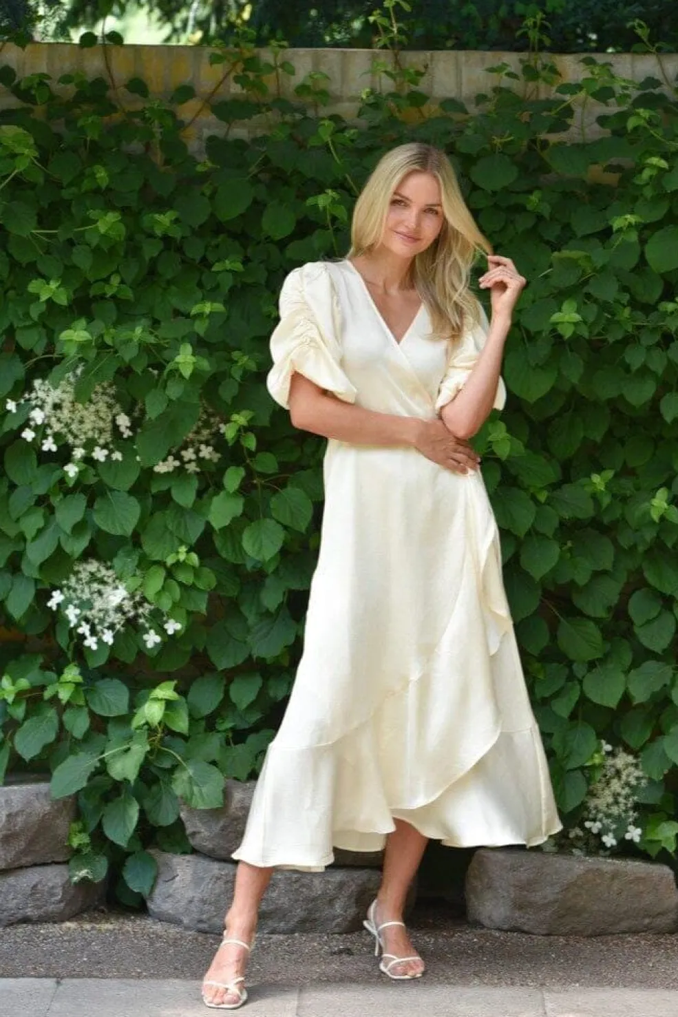 En lys gul kjole fra A-View i 100 % polyester med satinlook. Kjolen har et omslagsdesign med bindebånd i taljen og passer godt til fejringer og bryllupper.
