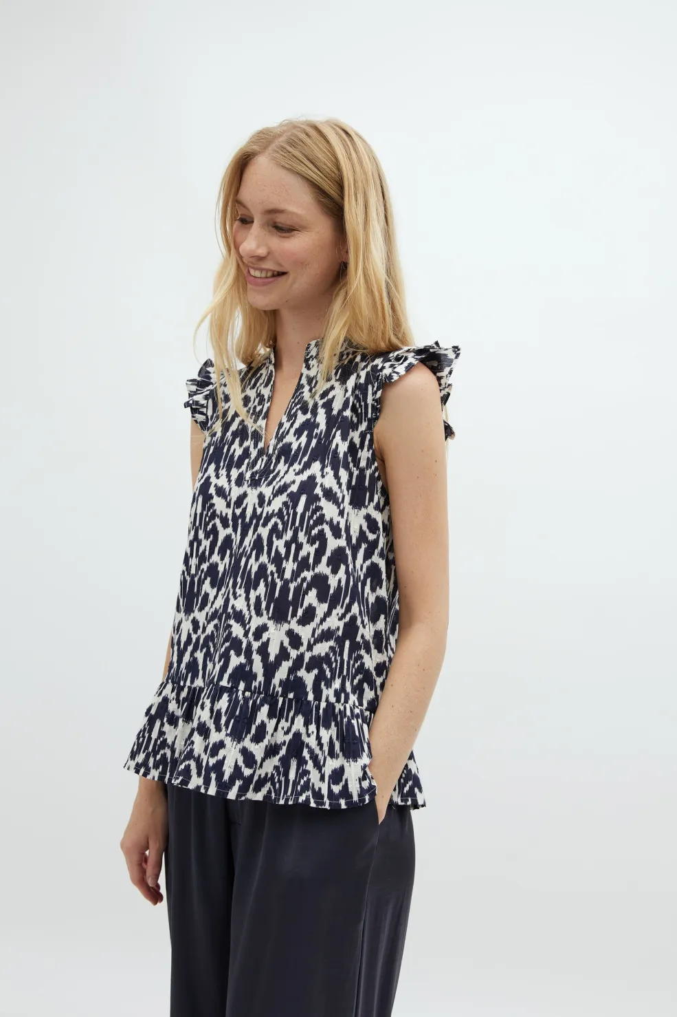 Bluse fra MbyM i mørkeblå og hvid med ikat-inspireret print. Den har flæsedetaljer ved ærmerne og en v-udskæring med knapper foran.