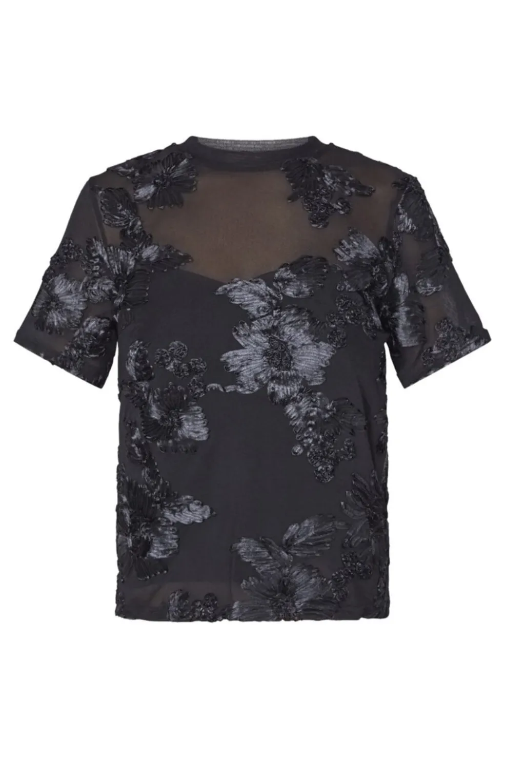 Sort T-shirt fra Sisters Point med broderede blomstermotiver. Materialet er delvist gennemsigtigt øverst og giver T-shirten et dekorativt udtryk.