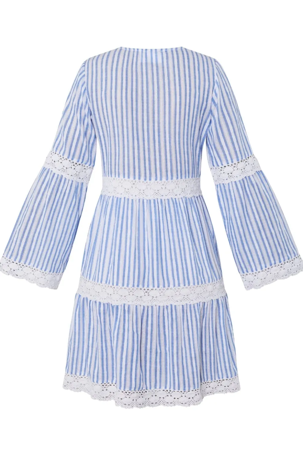 Stribet kjole fra Sisters Point med blå og hvide striber. Kjolen har blondedetaljer ved ærmerne og langs bunden, som giver et maritimt og feminint udtryk.