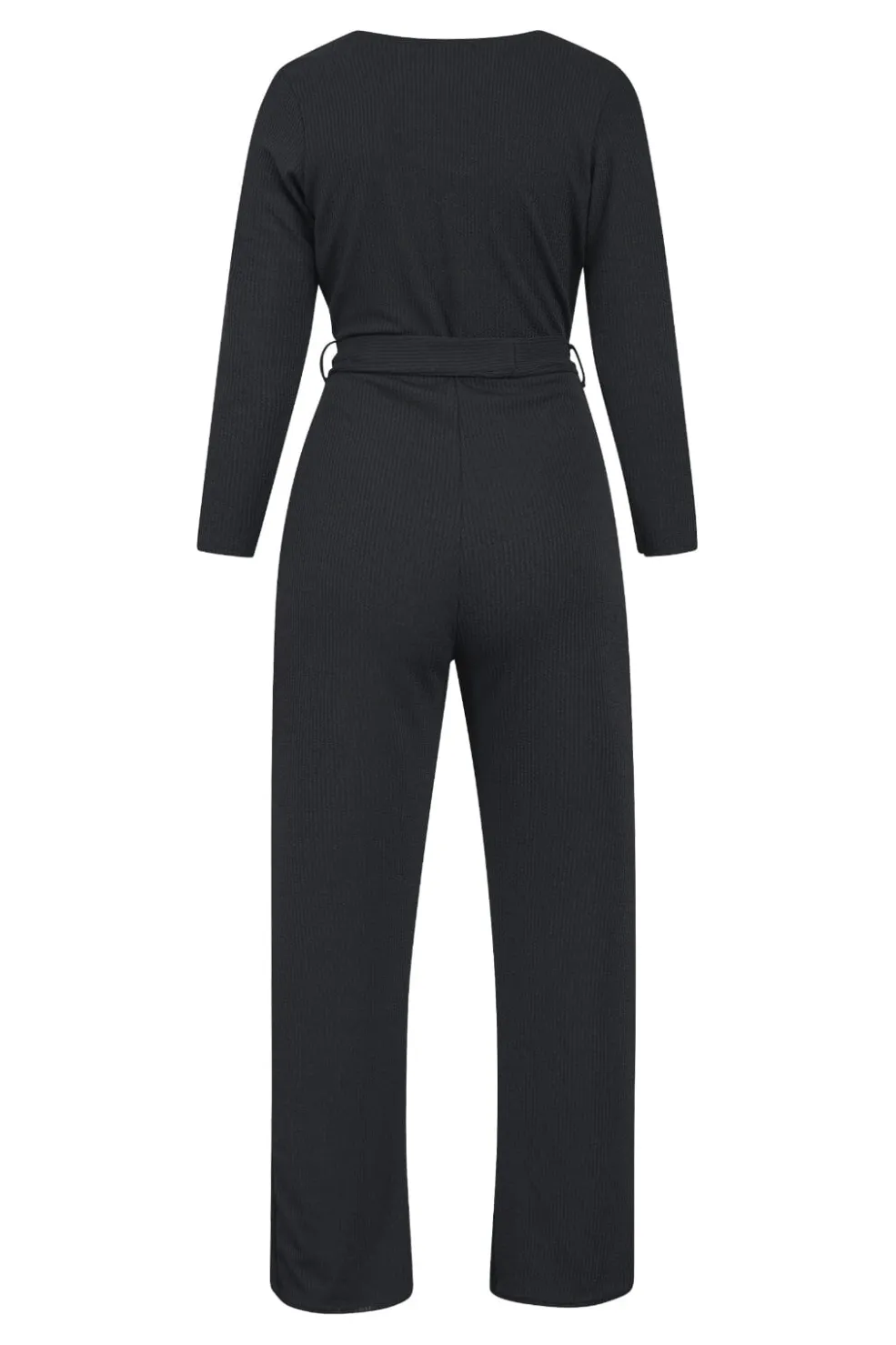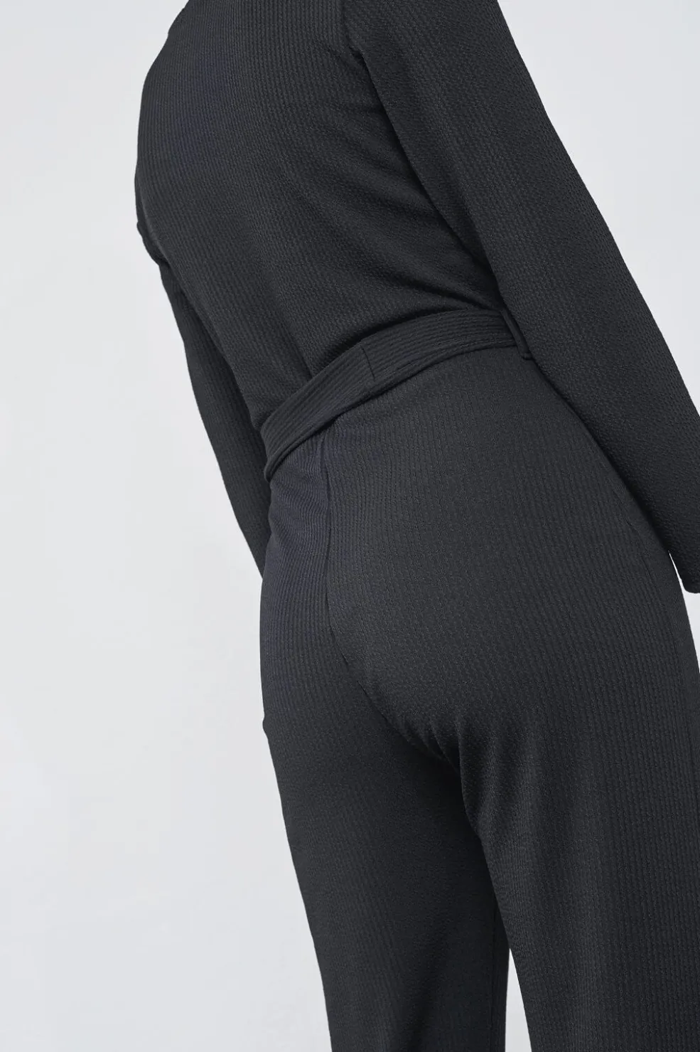 Sort jumpsuit fra Sisters Point i ribstof med wrap-design. Den har lange ærmer, V-halsudskæring og et bælte i taljen til justering af pasformen.