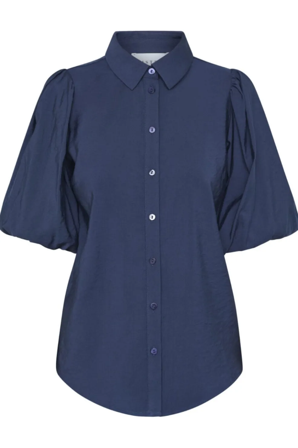 Marineblå skjorte fra Sisters Point med trekvartlange pufærmer og knaplukning. Skjorten har en klassisk skjortekrave og er lavet af en blanding af bambus og polyamid.