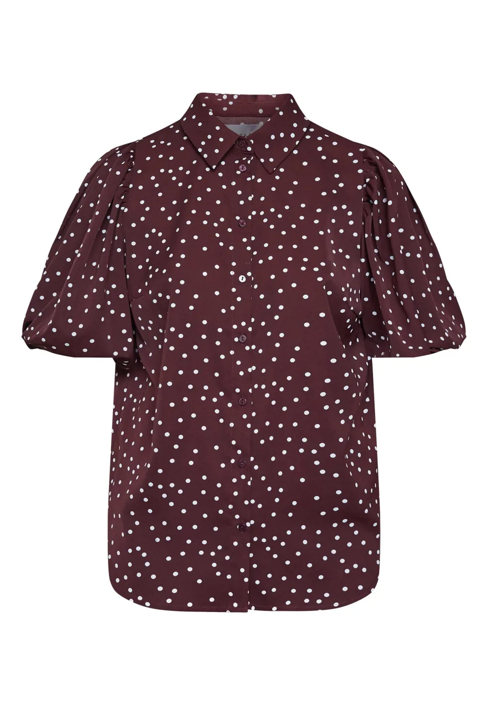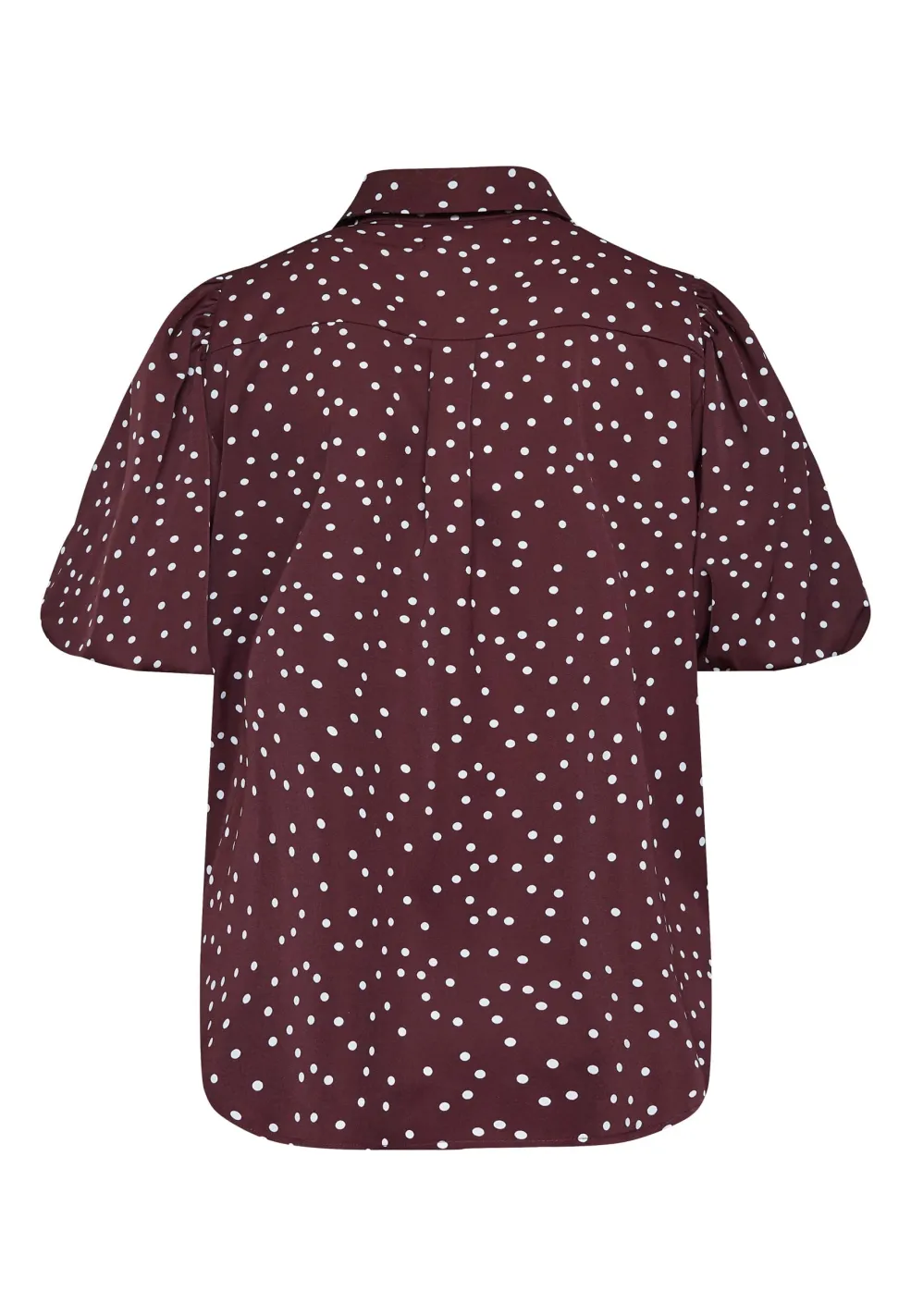 Bordeaux skjorte fra Sisters Point med hvide prikker. Skjorten har en klassisk skjortekrave, knaplukning og korte pufærmer i en løs pasform.