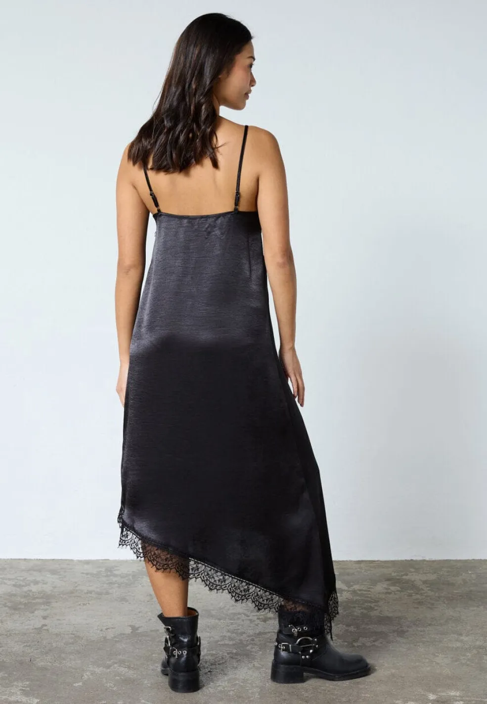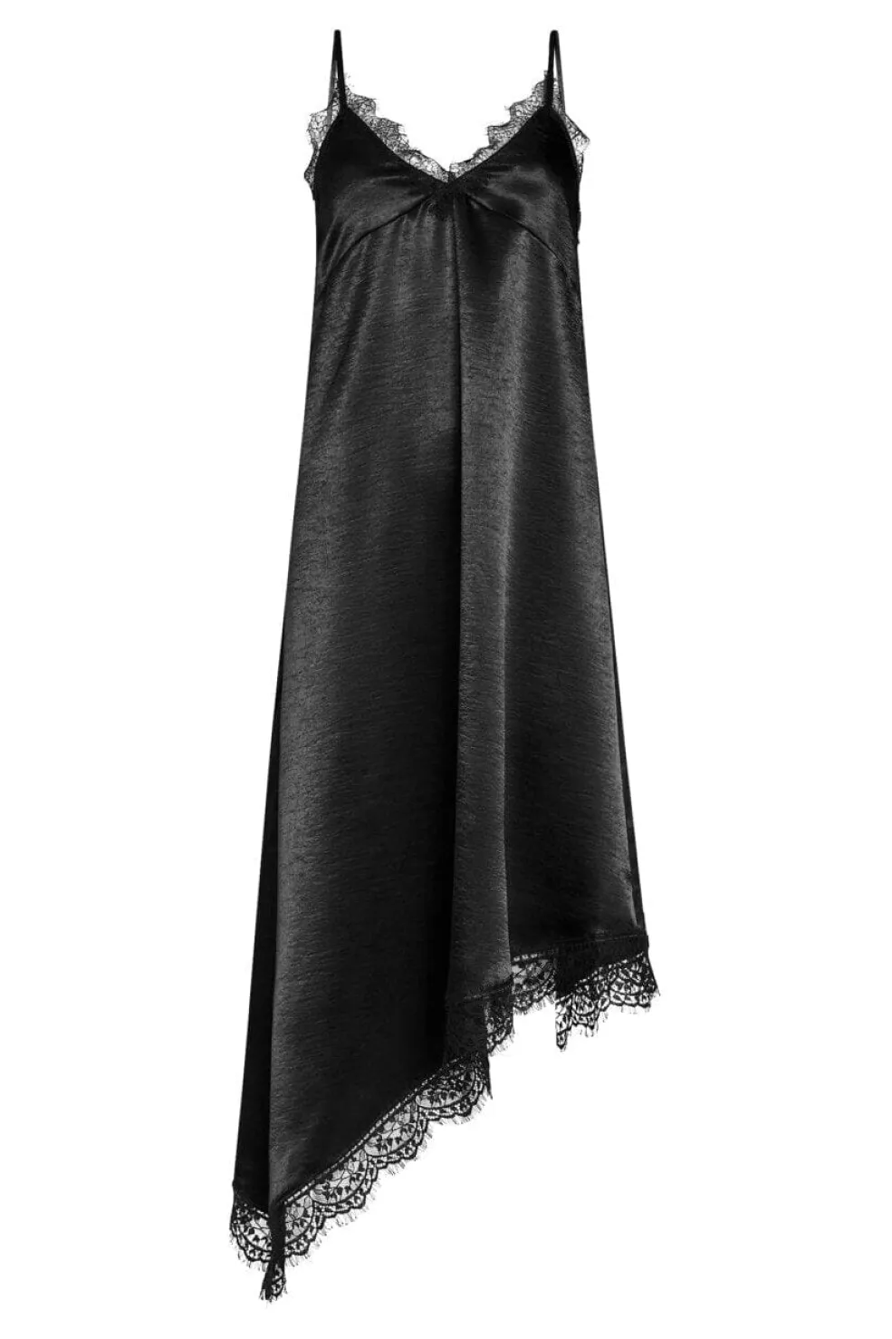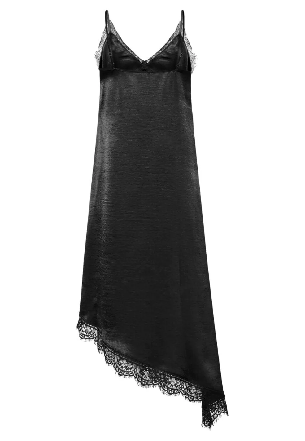 Sort kjole fra Sisters Point, lavet af skinnende satin-look materiale. Materialet er flydende og let med en glat overflade.
