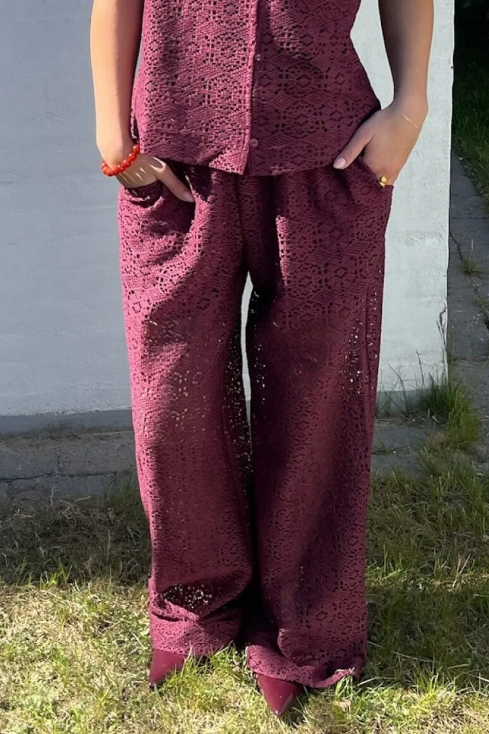 Bukser fra Sisters Point i en mørk bordeaux nuance. De har et gennemvævet mønster og påsyede undershorts. Bukserne er luftige og lette med en løs pasform.