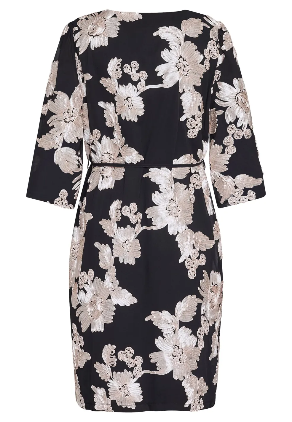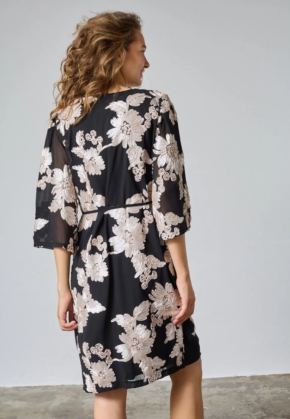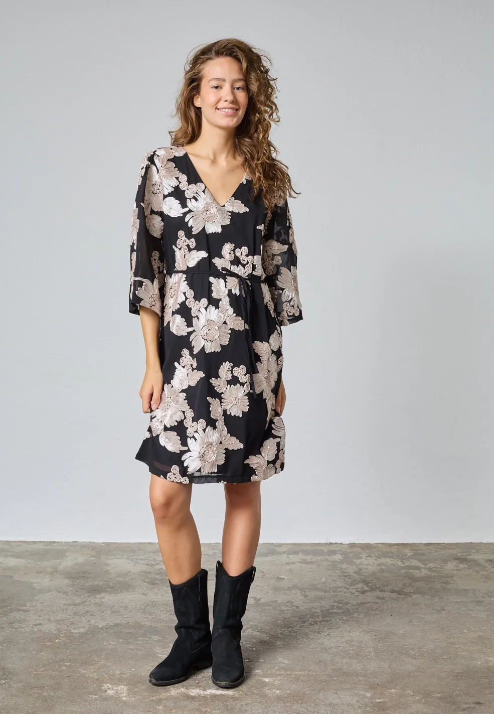 Sort kjole fra Sisters Point med et blomstermønster i champagne-nuancer. Kjolen har V-udskæring, trekvartlange ærmer og er knælang.