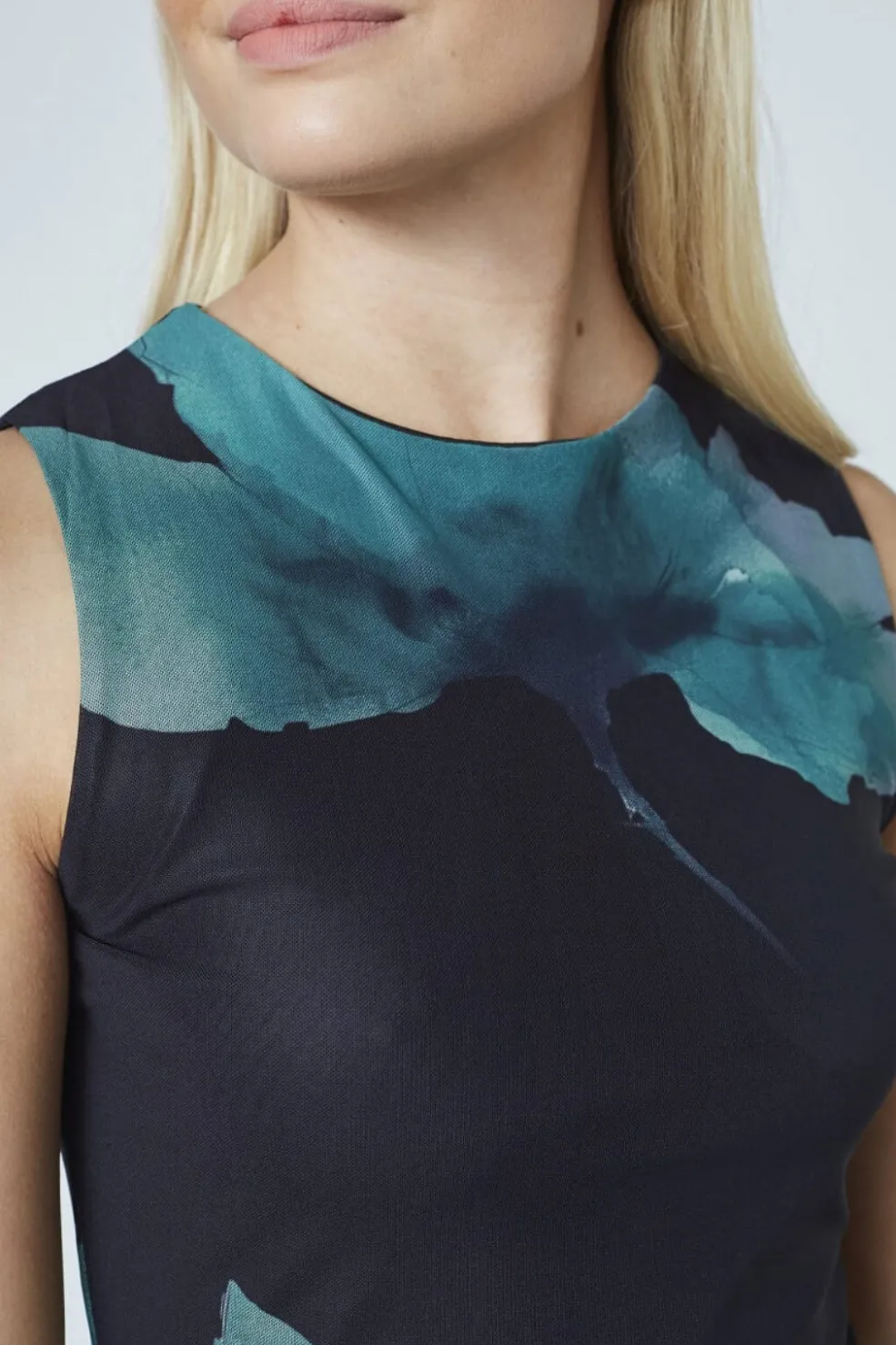 Lang kjole fra Sisters Point med store grønne blomster på mørk baggrund. Kjolen er ærmeløs og har en tætsiddende pasform.