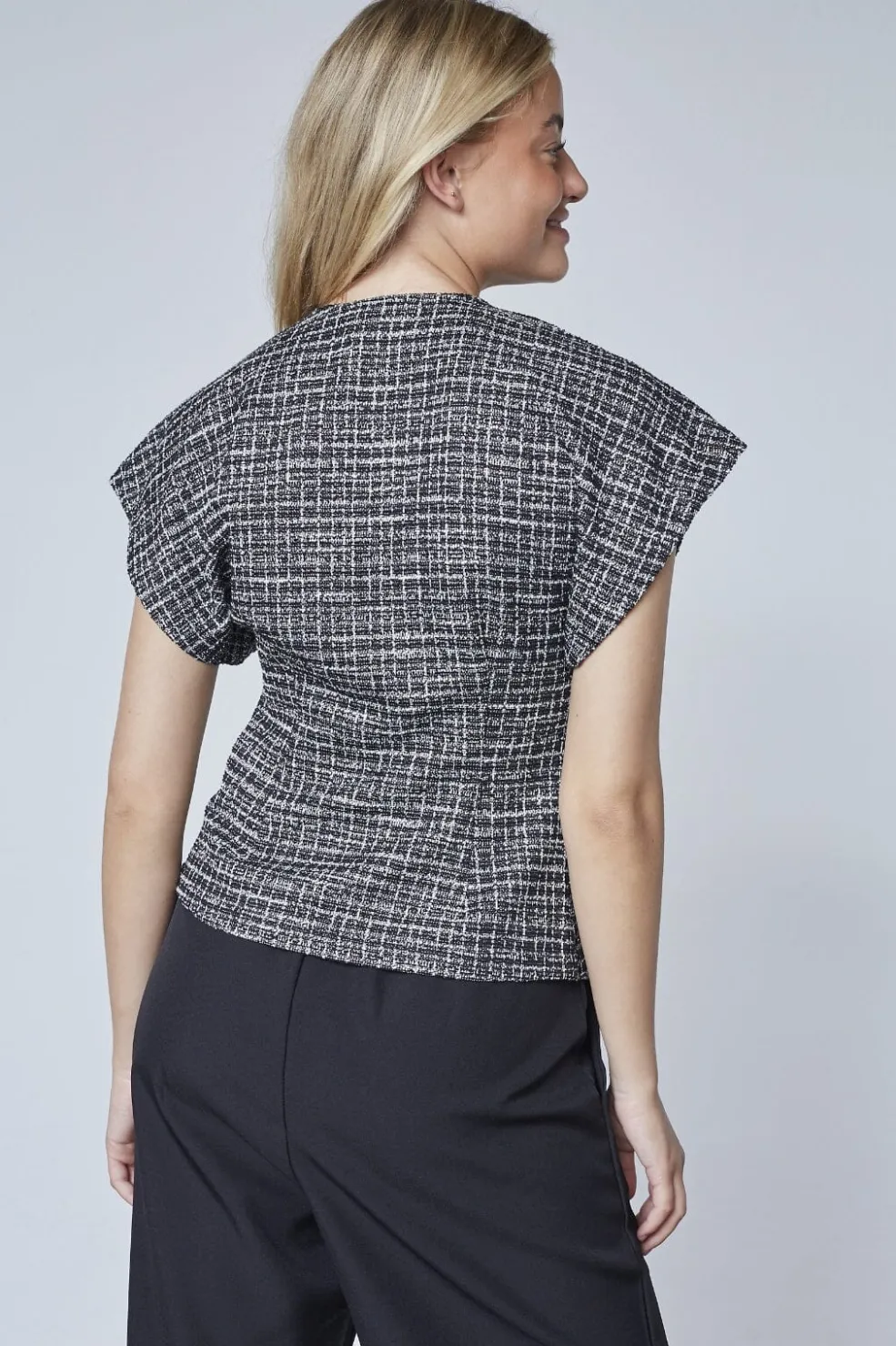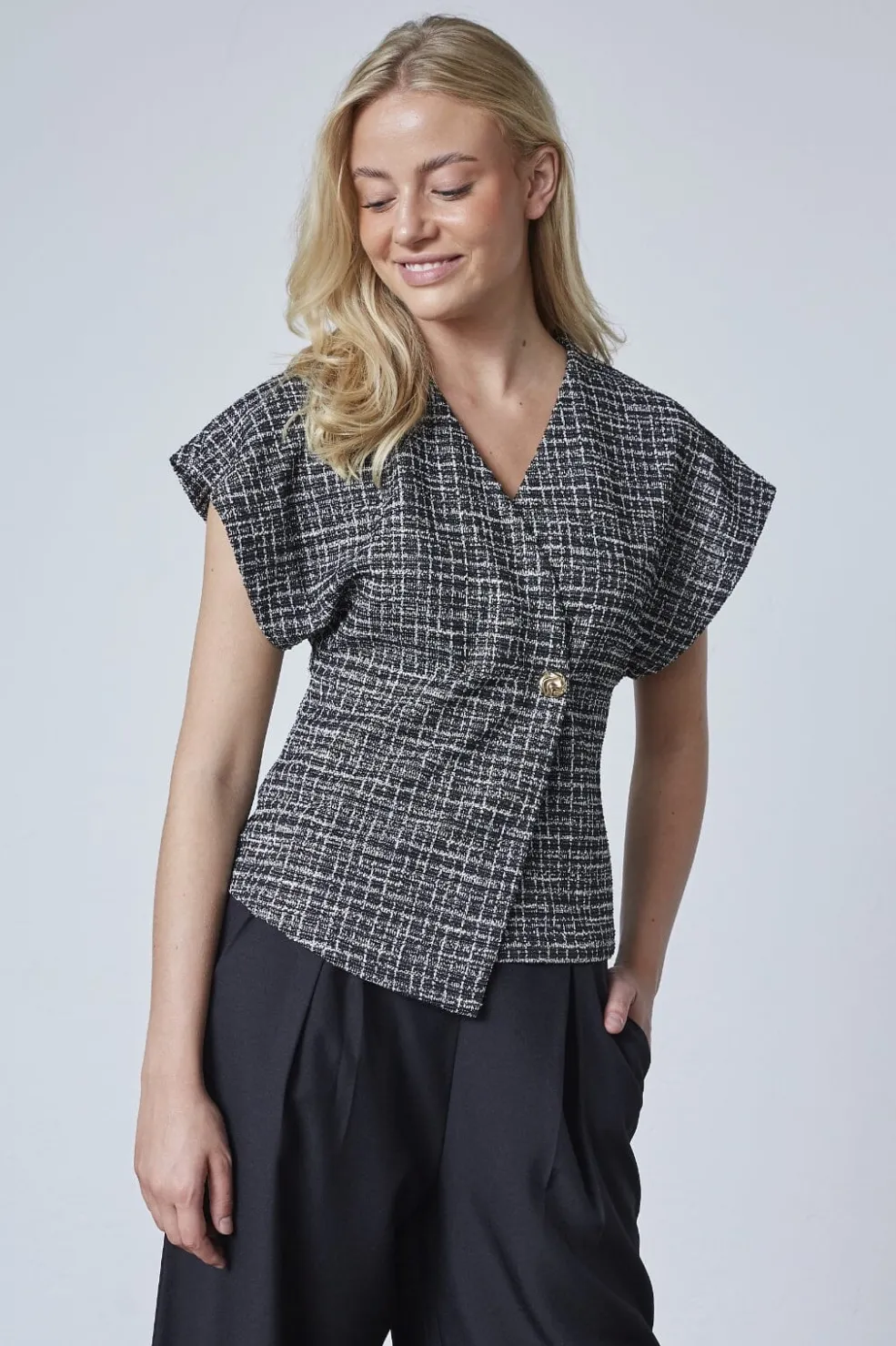 Sort og hvid ternet top fra Sisters Point med V-udskæring og korte ærmer. Toppen har en guldfarvet knapdetalje foran, der giver et stilrent udtryk.
