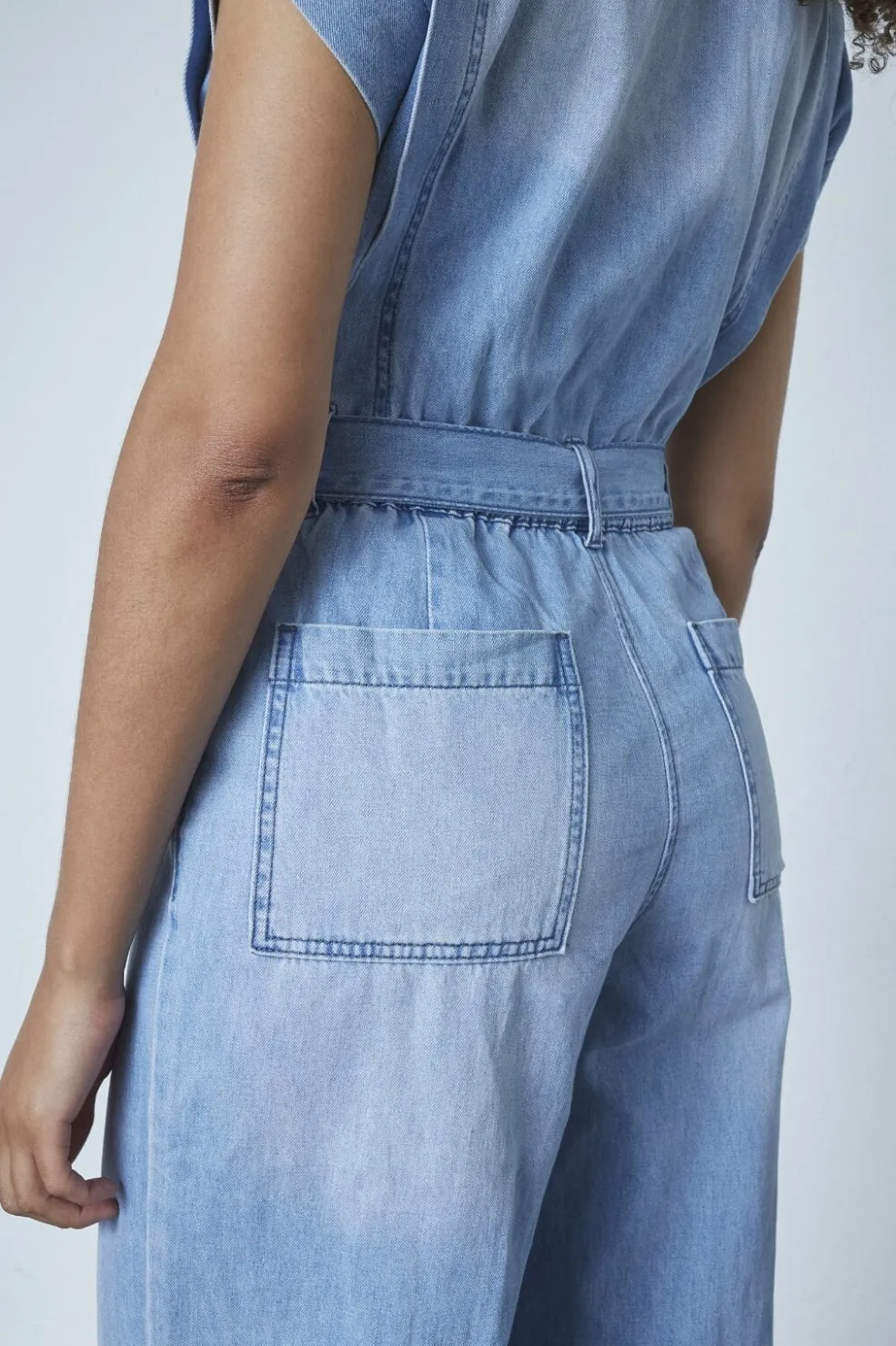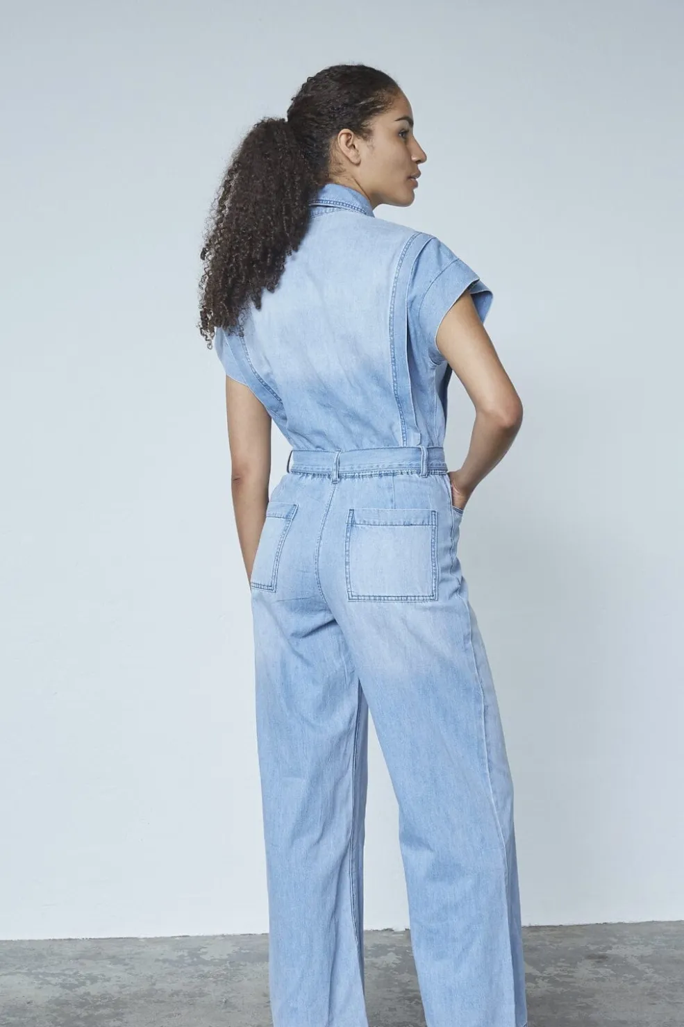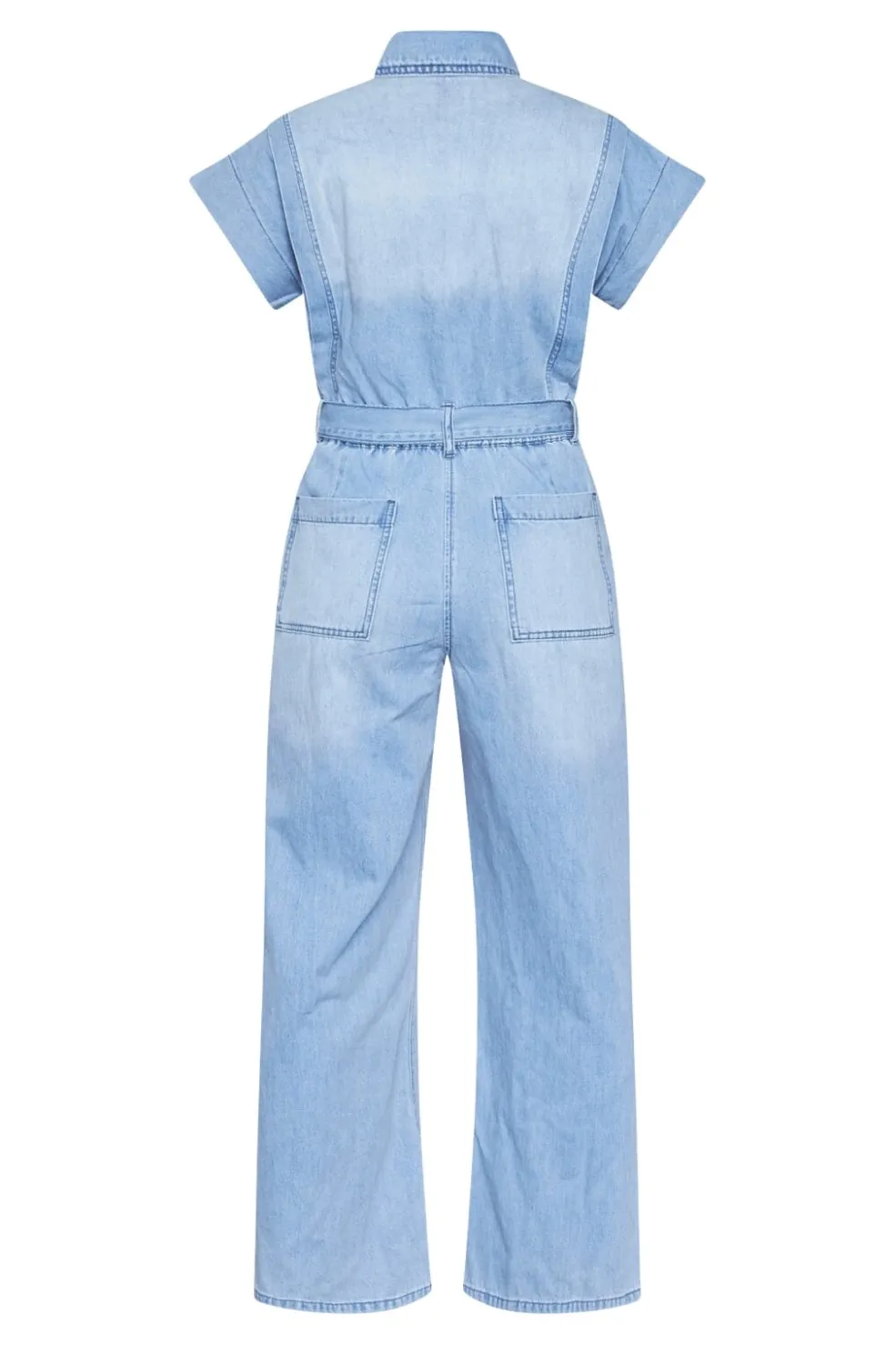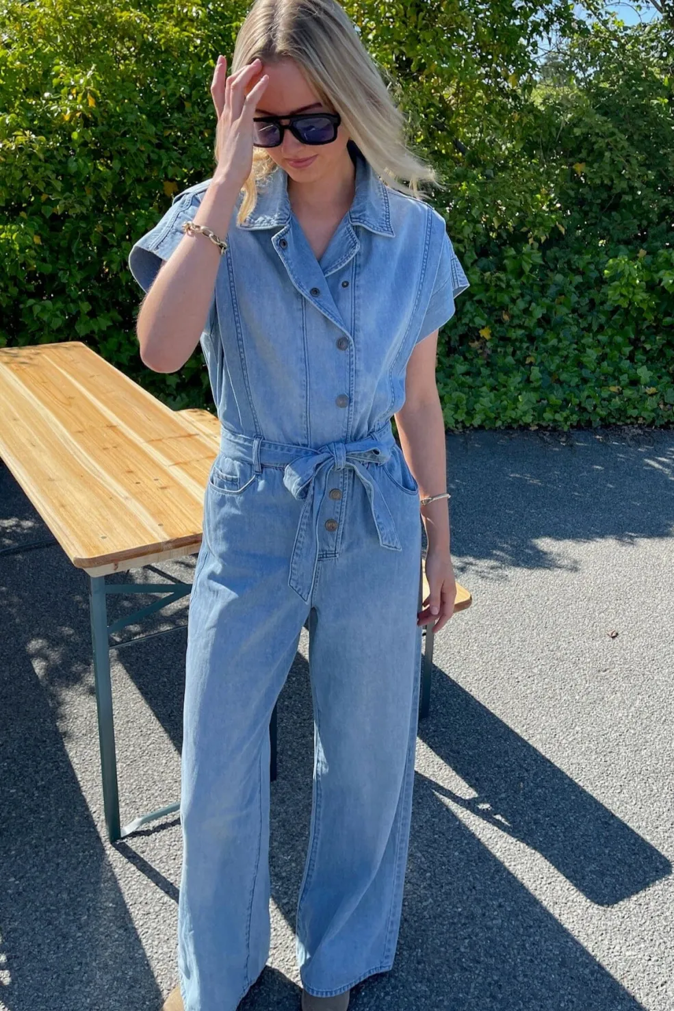 Lys blå denim jumpsuit fra Sisters Point med skjortekrave og korte ærmer. Jumpsuiten har en løs pasform og går til anklerne.