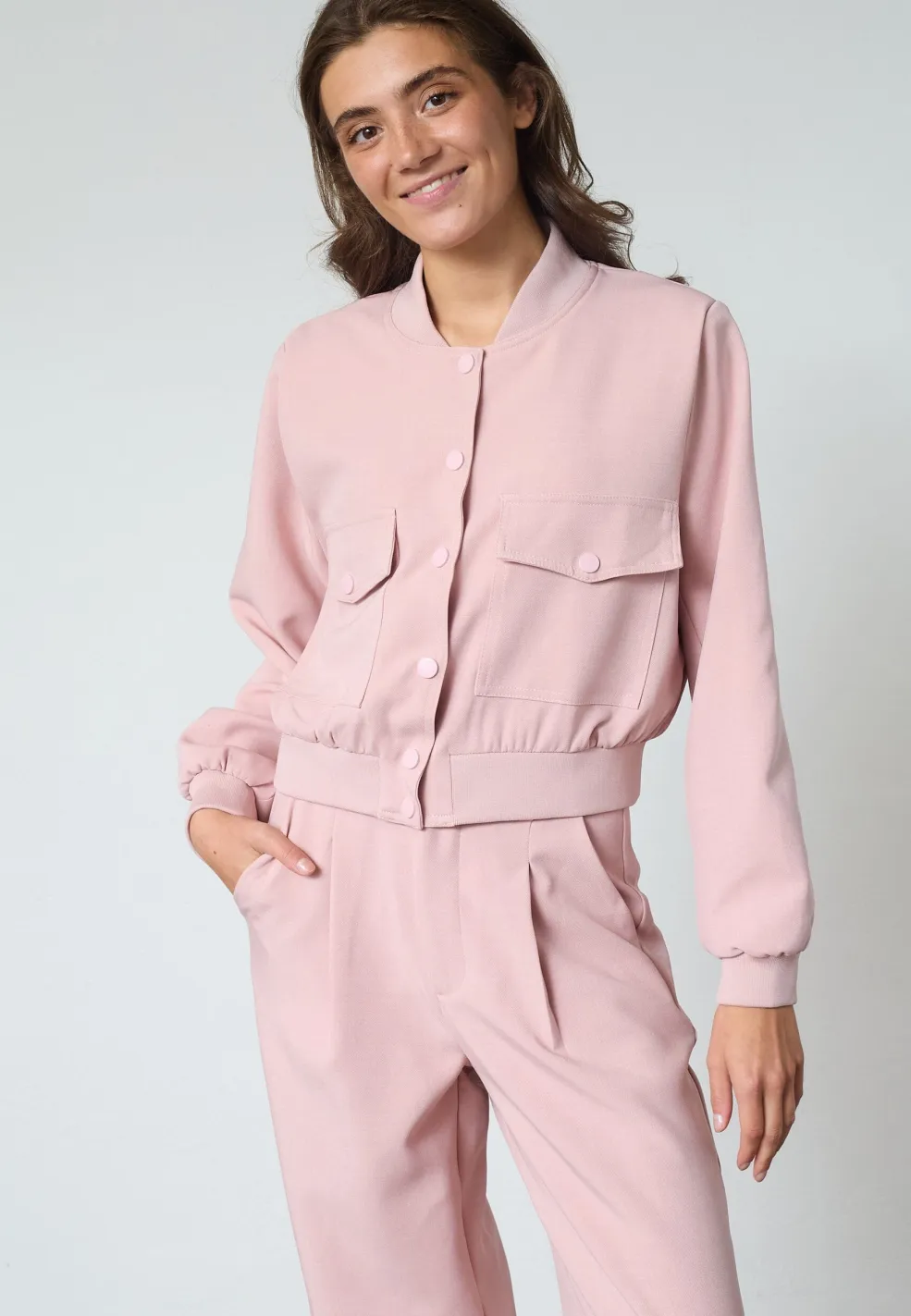 Kort jakke fra Sisters Point i lyserød nuance. Jakken er ensfarvet og passer til både afslappede og festlige lejligheder.