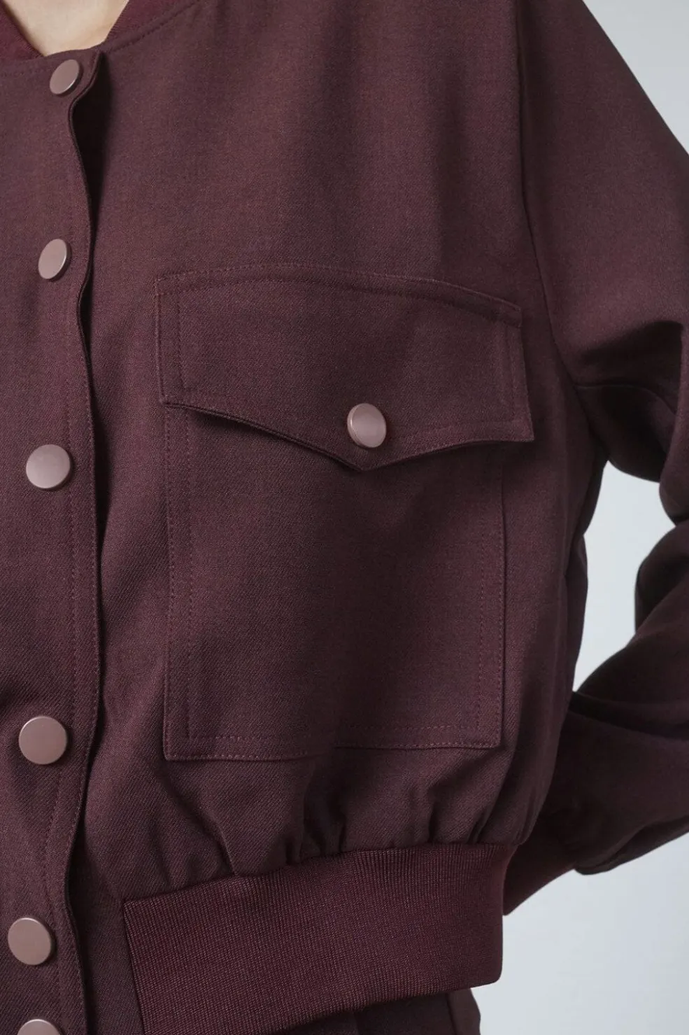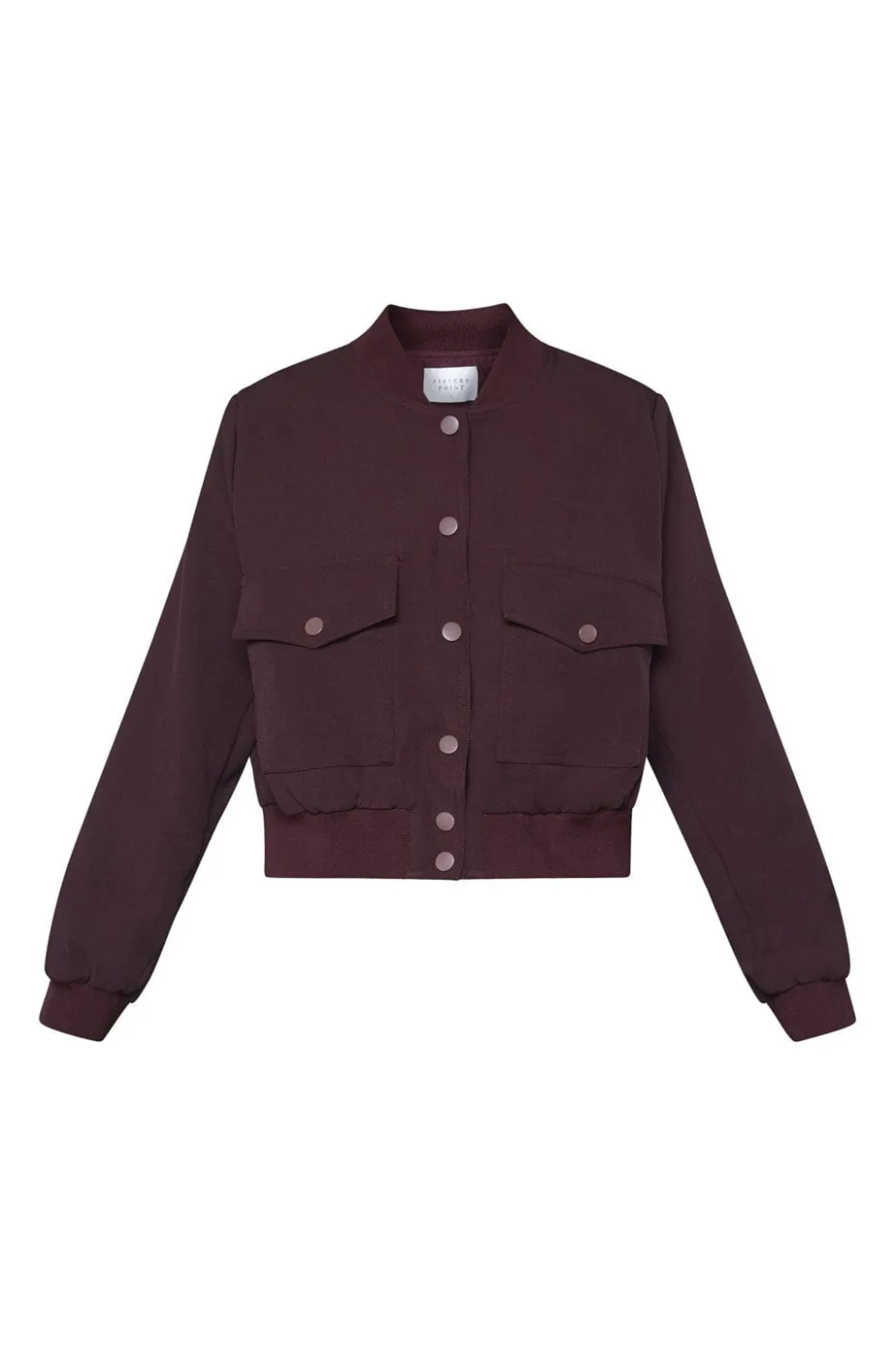 Kort jakke fra Sisters Point i dyb bordeaux. Den har trykknapper og knapper langs midten samt to praktiske frontlommer med knaplukning.