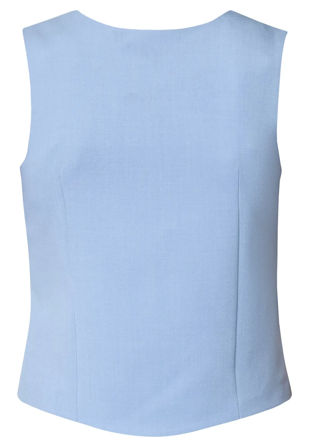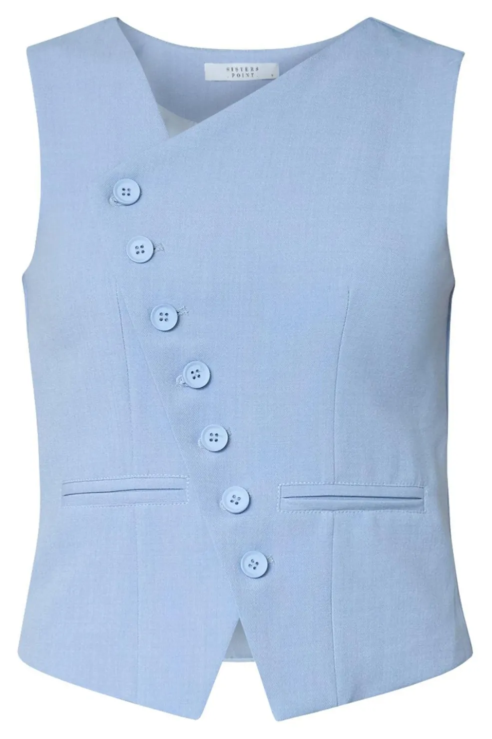 En lyseblå vest fra Sisters Point med asymmetrisk knaplukning og V-hals. Vesten har seks knapper ned langs fronten og to dekorative lommer.