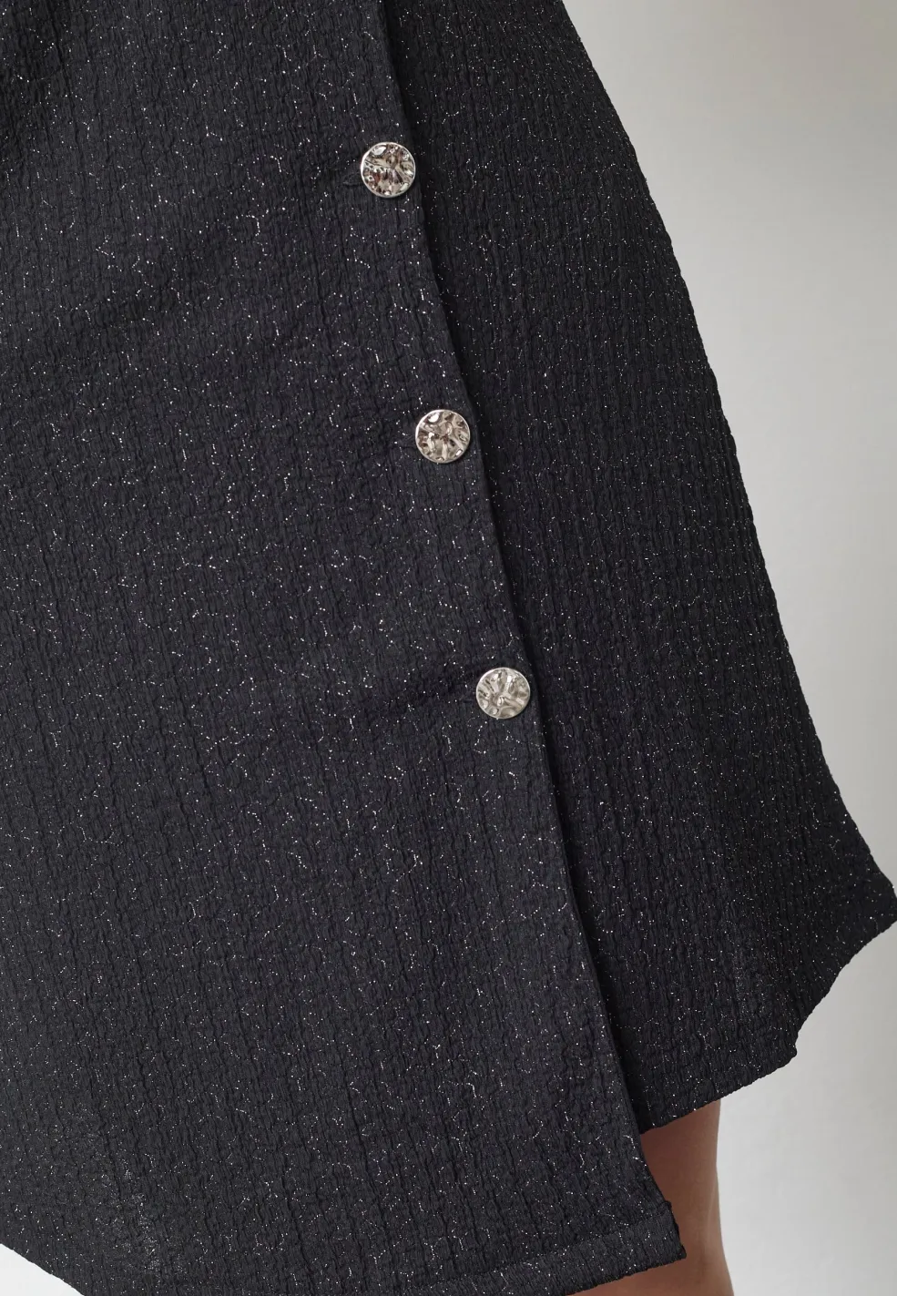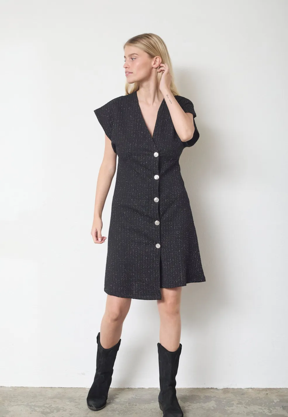 Sort kjole fra Sisters Point med sølvglimmerdetaljer. Kjolen har en dyb V-udskæring og korte ærmer. Dekorative knapper pryder fronten.
