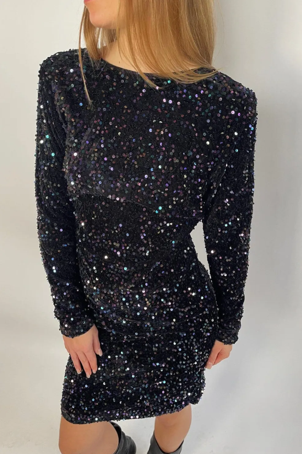 Sort kjole med flerfarvede pailletter fra Sisters Point. Kjolen er lavet til festlige lejligheder og har en tætsiddende pasform.